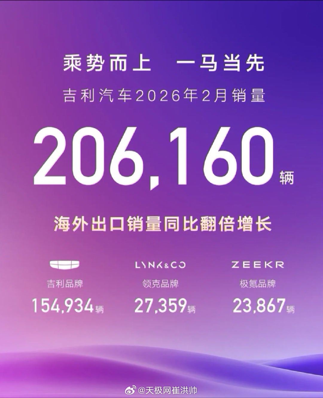 2026年2月汽车品牌销量:吉利汽车:206160辆长安汽车:170831辆比 亚 迪:165013辆奇瑞汽车:160765