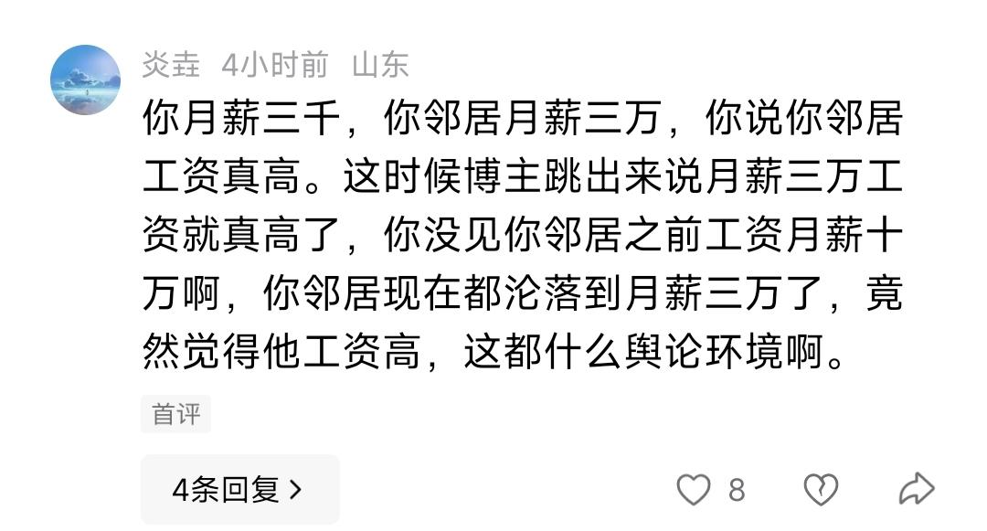 这不就是说明美国衰弱了么?它月薪十万的时候,我们月薪三千。现在它掉到三万,大殖子
