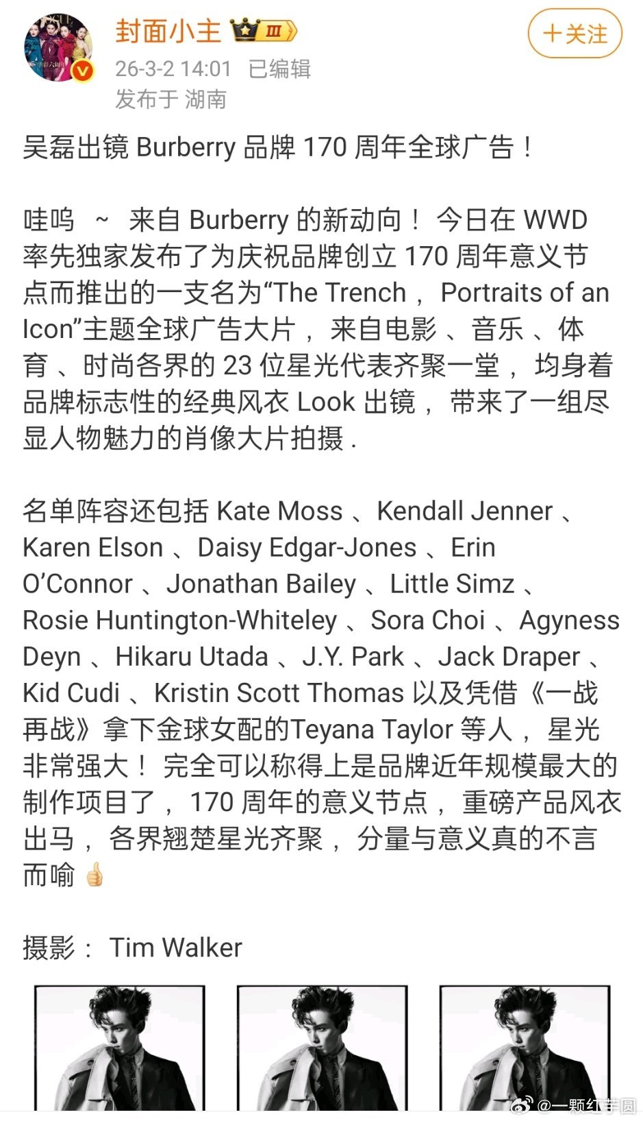 吴磊 出镜Burberry品牌170周年全球广告 !是这次唯一的中国面孔!!磊子
