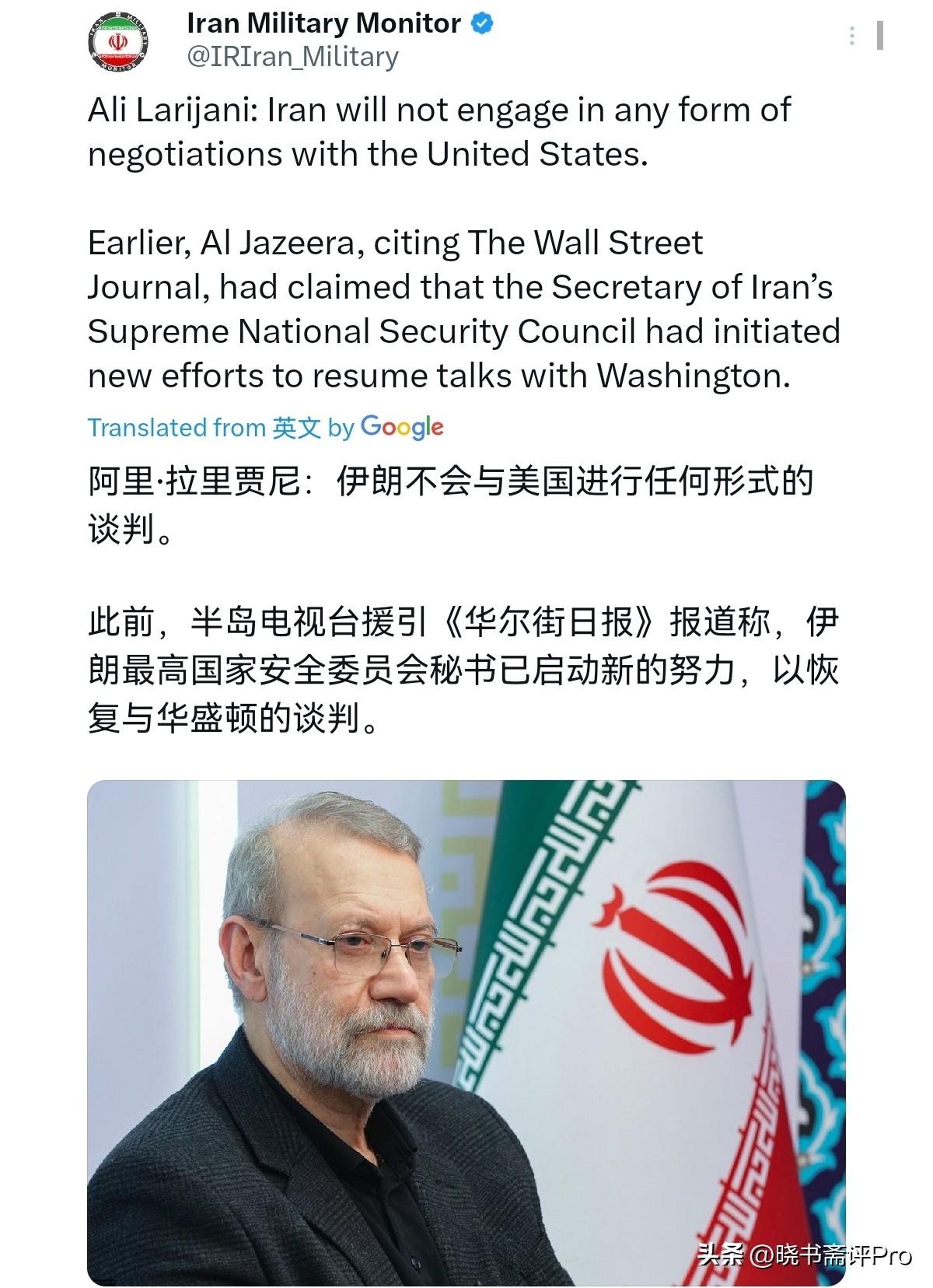 妥协的空间完全被堵死了!哈梅内伊的核心亲信拉里贾尼发出强音,美国和以色列想要诱降伊朗已经不可能!3月2日,外媒称,早些时候,半岛电视台援引《华尔街日报》的话称,伊朗最高国家安全委员会秘书已经开始了与华盛顿恢复谈判的新努力。但是,拉里贾尼一锤定音表示,伊朗不会与美国进行任何形式的谈判。 很显然,拉里贾尼的表态可以说这是定调性的表态。拉里贾尼是伊朗核心政治人物,也是伊朗最高国家安全委员会秘书、最高领袖哈梅内伊高级顾问,其在伊朗革命卫队人脉深厚,他本人的家族背景更是了得。拉里贾尼出身伊朗顶级宗教和政治世家,父亲是大阿亚图拉;岳父为阿亚图拉穆塔哈里,弟弟萨迪克·拉里贾尼曾任伊朗司法总监。 其对伊朗的政治影响力可以说是举足轻重的。事实上,在拉里贾尼表态之前,伊朗总统佩泽什基安在向全国发表讲话时也表示:我们将摧毁敌人的基地和能力,使他们陷入绝望。面对敌人的计划,我们必须团结一致。很显然,面对美国和以色列明暗两条线对伊朗的重压,伊朗已经作出了自己的选择。 这样的表态,对内是安定人心,团结各方,对外就是宣告。无疑,美国和以色列通过空袭让伊朗屈服的算盘肯定是落空了,接下来的战争,只会更加复杂和难以预测。美以一招不慎,就有可能陷入长期的消耗战,弄不好自己将很难脱身。局势发展至此,这肯定不是美国期待的方向。