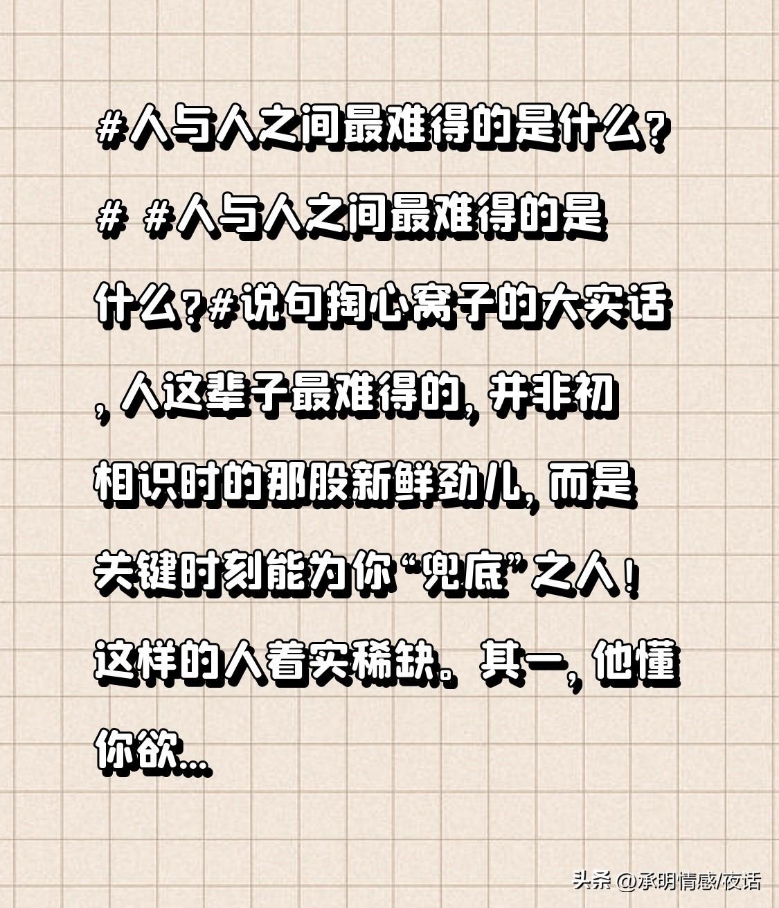 人与人之间最难得的是什么? 人与人之间最难得的是什么? 说句掏心窝子的大实话,人这辈子最难得的,并非初相识时的那股新鲜劲儿,而是关键时刻能为你“兜底”之人! 这样的人着实稀缺。其一,他懂你欲言又止,无需你费力解释,一个眼神便心领神会;其二,面对利益纠葛,他能克制自私,绝不背后使坏,人品过硬;其三,他能包容你的小脾气与偶尔的落魄,既爱你的风光,更疼你的狼狈。这种“稳稳的善意”堪称人间极品。 你身边有能为你“兜底”的人吗?评论区晒晒,觉得扎心就点赞收藏