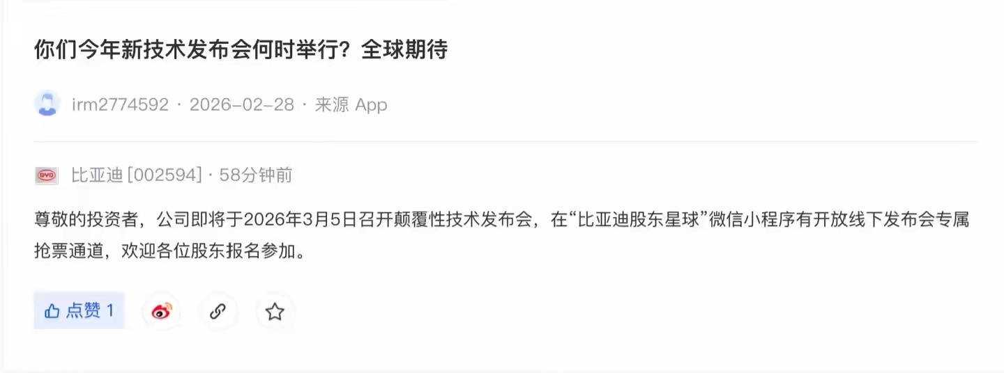 比亚迪股票大涨7% 和 3月5号比亚迪发布颠覆性技术 这两个话题已经把今天下午的节奏带起来了。说实话,惊蛰这天开发布会真有戏:自然界苏醒、气候变动都在提示“变革”的意思,比亚迪这一招选得挺有意思。开年就说要把“更惊艳的技术”拿出来,大家都在等那一声惊雷,结果股票直接起飞,说明市场也有共识。