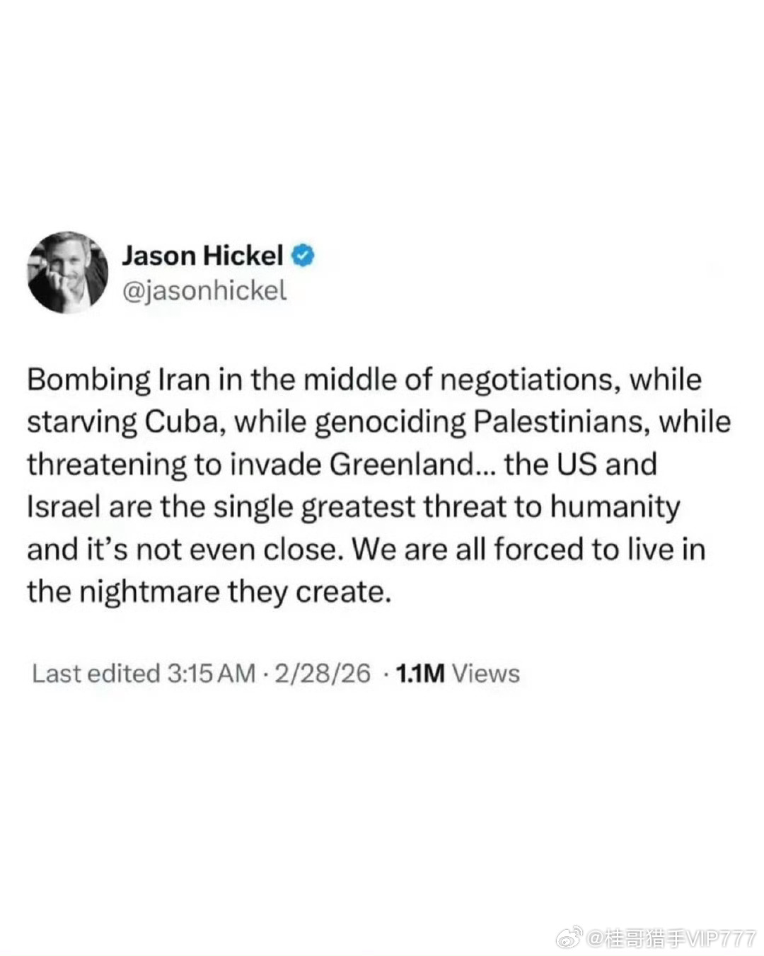 森·希克尔√ 在谈判期间轰炸伊朗,同时让古巴忍饥挨饿,实施针对巴勒斯坦人的种族灭绝政策,并威胁要入侵格陵兰岛......美国和以色列是人类面临的最大单一威胁,且这一地位无可匹敌。我们都被迫生活在它们所制造的梦魇之中。
