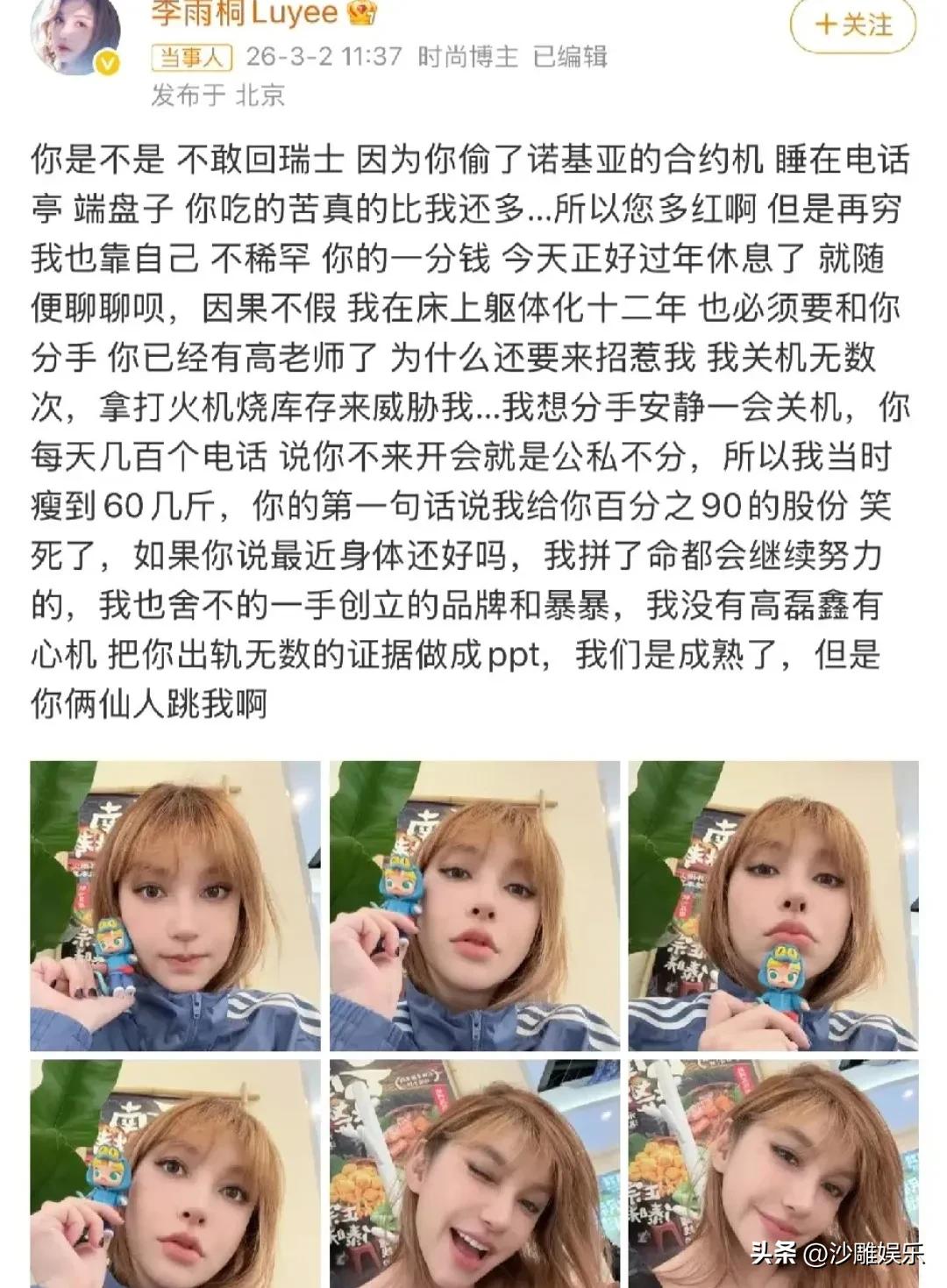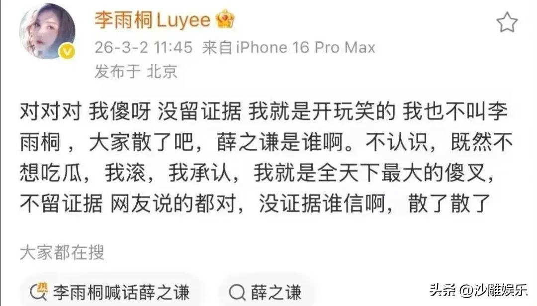 李雨桐薛之谦,冲上热搜! 就在3月2日,李雨桐突然杀了个回马枪,在微博上实名硬刚薛之谦,那架势简直是要直接“大结局”。她不仅放狠话“君子报仇,十年不晚”,还列了个详细的“归还清单”:又是沛纳海手表,又是《演员》MV里的蓝色西装,甚至连抑郁症12年、体重暴跌到60斤这种陈年旧伤疤都重新揭开,看着确实让人揪心 。 更劲爆的是,她还拉高磊鑫下场,说高磊鑫手里有薛之谦出轨的PPT证据,当年离婚时薛之谦之所以净身出户,就是因为被这个“致命PPT”拿捏了 。这剧情,听起来是不是很刺激?网友们刚搬好小板凳,准备见证“雷神之锤2.0”,结果李雨桐画风突变,秒删微博后改口:“我没证据,我开玩笑的,散了吧”,甚至反问网友“薛之谦是谁?不认识” 。 好家伙,这哪是复仇啊,这简直是单方面的“精神内耗”。薛之谦和高磊鑫从头到尾一个字没说,李雨桐自己就把这场大戏演成了“独角戏”,还是逻辑混乱的那种。更让人出戏的是,一边喊着要报仇,一边又被网友发现去年直播时还在夸薛之谦人挺好 。这种极度的矛盾,让网友直呼:这到底是炒作,还是这么多年真憋出内伤了? 说实话,不管当年谁对谁错,这种发了删、删了发的反复横跳,不仅消耗了网友最后一丝耐心,更像是一面镜子,照出了她内心深处那种放不下又赢不了的挣扎 。如果真如她所说受了这么大委屈,那就拿出让人心服口服的证据;如果只是想宣泄情绪,那也大可不必占用公共资源。薛之谦那边依旧是“沉默是金”,这场闹剧到最后,似乎只剩李雨桐一个人在风中凌乱。 也不知道她睡醒一觉,还记不记得昨天自己说过的话?