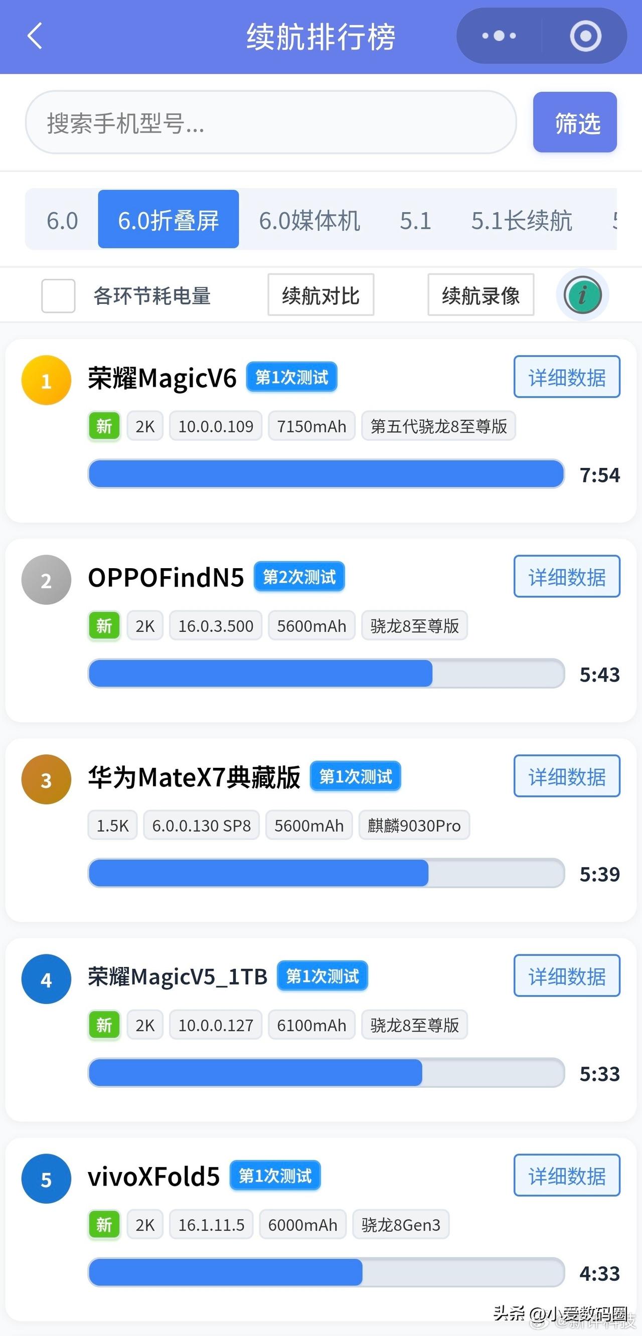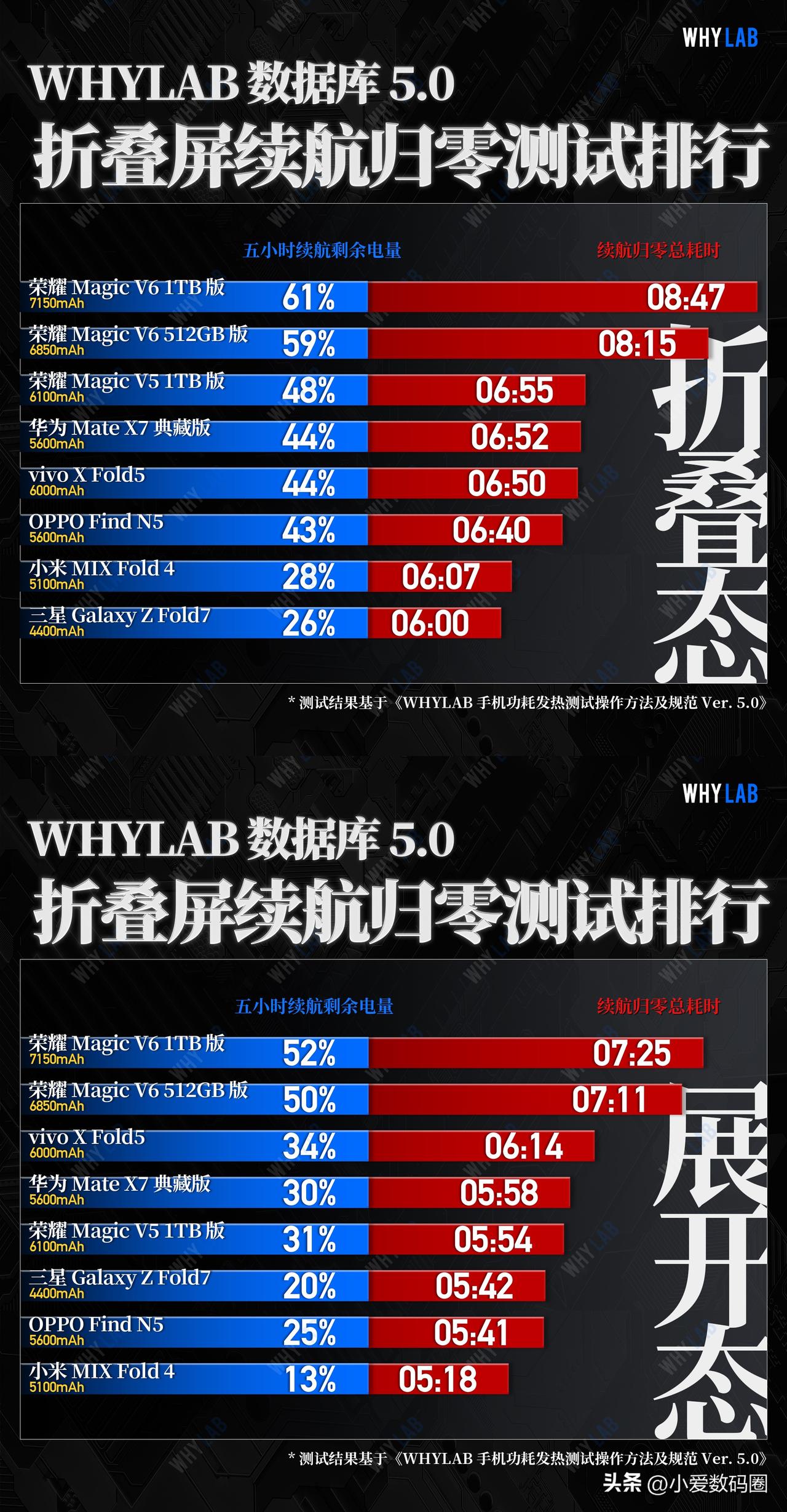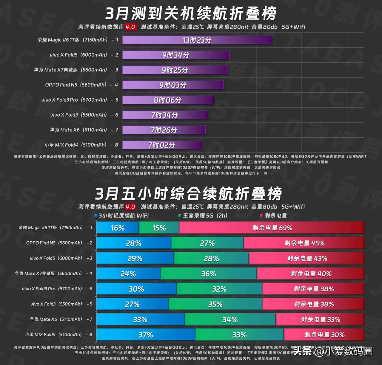 荣耀Magic V6折叠屏续航测试结果汇总: 小白测评:7小时20分,V5是6小时36分 WHYLAB:8小时47分,V5 6小时55分 测评君:13小时23分,X Fold5 9小时34分 新评测评:7小时54分,Find N5 5小时43分 因为不同测试模型有不同续航结果,但也可以看出荣耀Magic V6续航相比于上一代的大折叠来说续航时间提高了有1~2小时,很猛! 折叠屏迈进7000mAh大电池时代