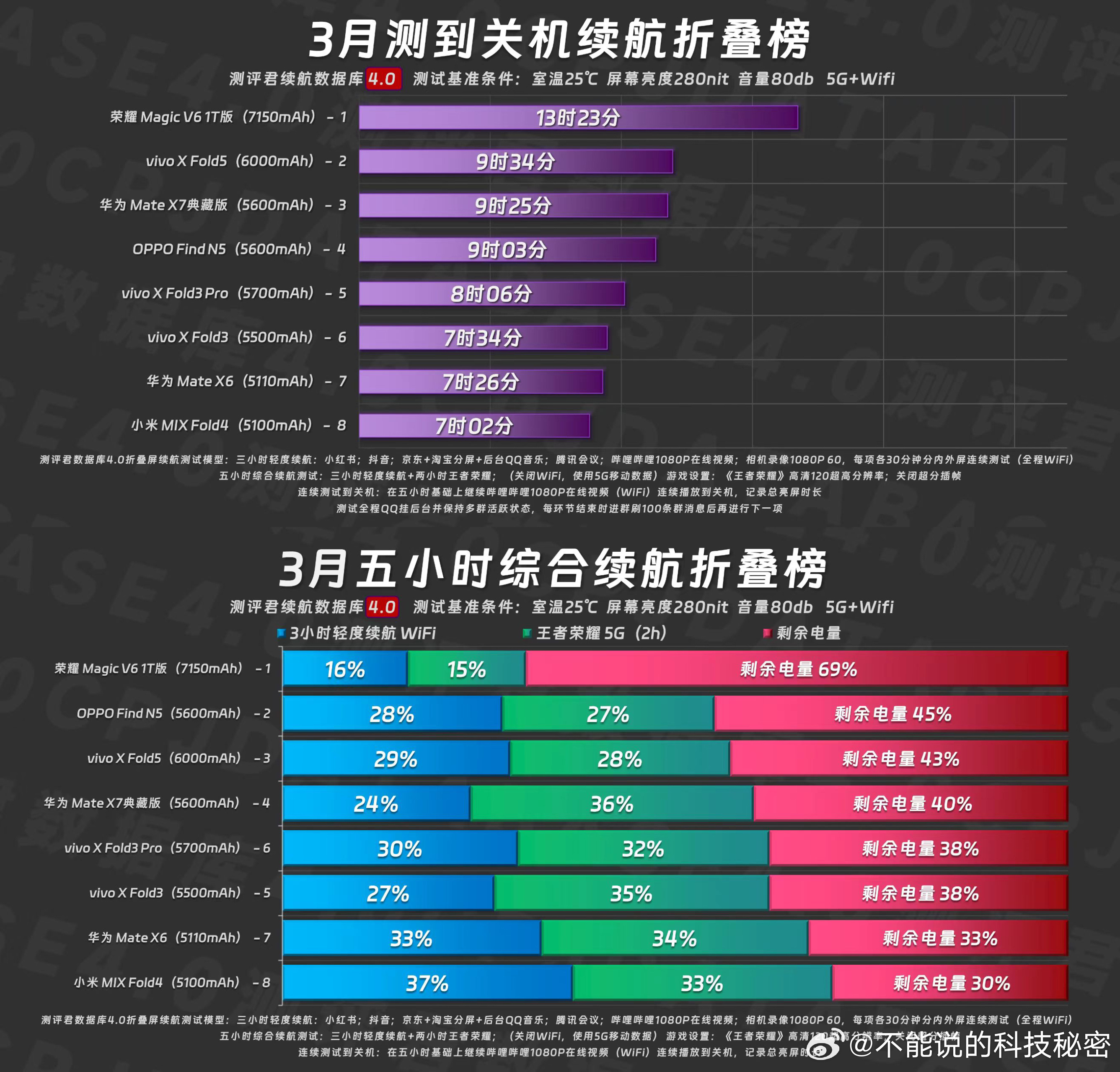 折叠屏迈进7000mAh大电池时代你敢相信吗?折叠屏手机也能电池达到7000毫安时以上,这是知名博主的测评数据,你觉得怎样?荣耀MagicV6续航第一双霸榜
