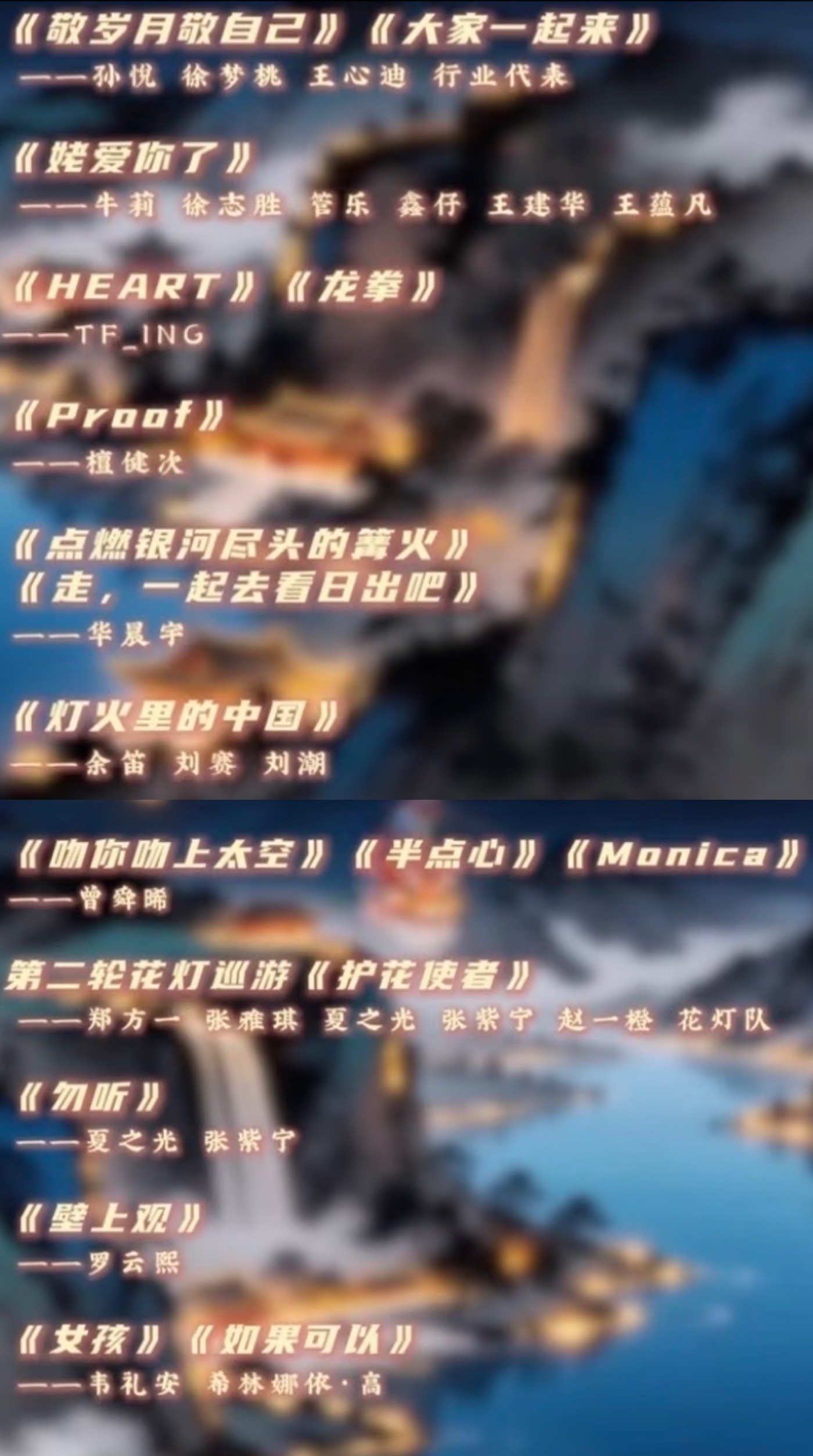 湖南卫视元宵喜乐会节目单《威风锣鼓闹元宵》袁一琦、张峻豪、安崎《西楼别序》刘宇《梦见你》周深《元宵恰恰》刘忻、张予曦、郭碧婷《吻你吻上太空》曾舜晞《勿听》夏之光、张紫宁《壁上观》罗云熙《女孩》韦礼安、希林娜依高《Heart》TFING(穆祉丞、邓佳鑫、张子墨、童禹坤、黄朔)《Proof》檀健次《点燃银河尽头的篝火》华晨宇 湖南卫视元宵晚会全阵容