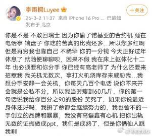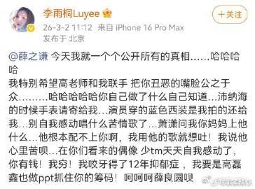 李雨桐称高磊鑫有薛之谦出轨的证据家人们,娱乐圈的瓜总是一个接着一个,这不,李雨桐那可是又扔出了一个重磅炸弹,宣称高磊鑫手里有薛之谦出轨的证据。这消息一出来,瞬间就像一颗石子投入了平静的湖面,激起了千层浪啊!李雨桐,大家肯定不陌生,之前就和薛之谦有过一段剪不断理还乱的纠葛。她在娱乐圈的爆料界那也算是小有名气了,每次开口都能引发一场舆论风暴。这次她又站出来说高磊鑫有薛之谦出轨的证据,这可让吃瓜群众们的好奇心一下子就被勾起来了。薛之谦,曾经可是凭借着才华和深情的形象圈粉无数。他的歌曲那是一首比一首火,什么《演员》《绅士》,不知道唱出了多少人的心声。可这几年,他的感情生活却成了大家茶余饭后的谈资。他和高磊鑫的复合,当时还被很多人看作是破镜重圆的典范,可如今这李雨桐的爆料,无疑是给这段看似美好的感情蒙上了一层阴影。高磊鑫呢,一直比较低调,在薛之谦的感情生活中就像一个神秘的存在。如果真如李雨桐所说,她手里有薛之谦出轨的证据,那这背后又隐藏着怎样的故事呢?是高磊鑫在默默守护着什么,还是这只是李雨桐的一面之词?有专家分析,在娱乐圈这个复杂的环境里,感情和利益往往是交织在一起的。明星们的感情生活不仅仅是个人的私事,还会影响到他们的形象和商业价值。薛之谦作为当红歌手,他的形象一旦受损,那带来的经济损失可不小。据相关数据显示,明星因为负面新闻导致代言丢失、演出减少等情况屡见不鲜。咱们再来说说李雨桐爆料的动机。有人猜测她可能是想为自己讨回一个公道,毕竟之前她和薛之谦的那些事儿闹得沸沸扬扬。也有人觉得她是想借助这个话题重新回到大众的视野。不管怎样,她的这次爆料无疑是把薛之谦和高磊鑫又推到了舆论的风口浪尖。不过,目前这都还只是李雨桐的单方面说法,并没有确凿的证据。薛之谦和高磊鑫也都还没有做出回应。在真相大白之前,咱们也只能当个吃瓜群众,静静等待后续的发展。娱乐圈的这些事儿就像一场没有剧本的大戏,永远不知道下一幕会发生什么。李雨桐这次爆料高磊鑫有薛之谦出轨的证据,让我们看到了娱乐圈感情生活的复杂和多变。在没有确凿证据之前,咱们还是要保持理性,不要轻易下结论。说不定等真相出来,又是一个让人意想不到的反转呢!让我们一起搬好小板凳,继续吃瓜吧!