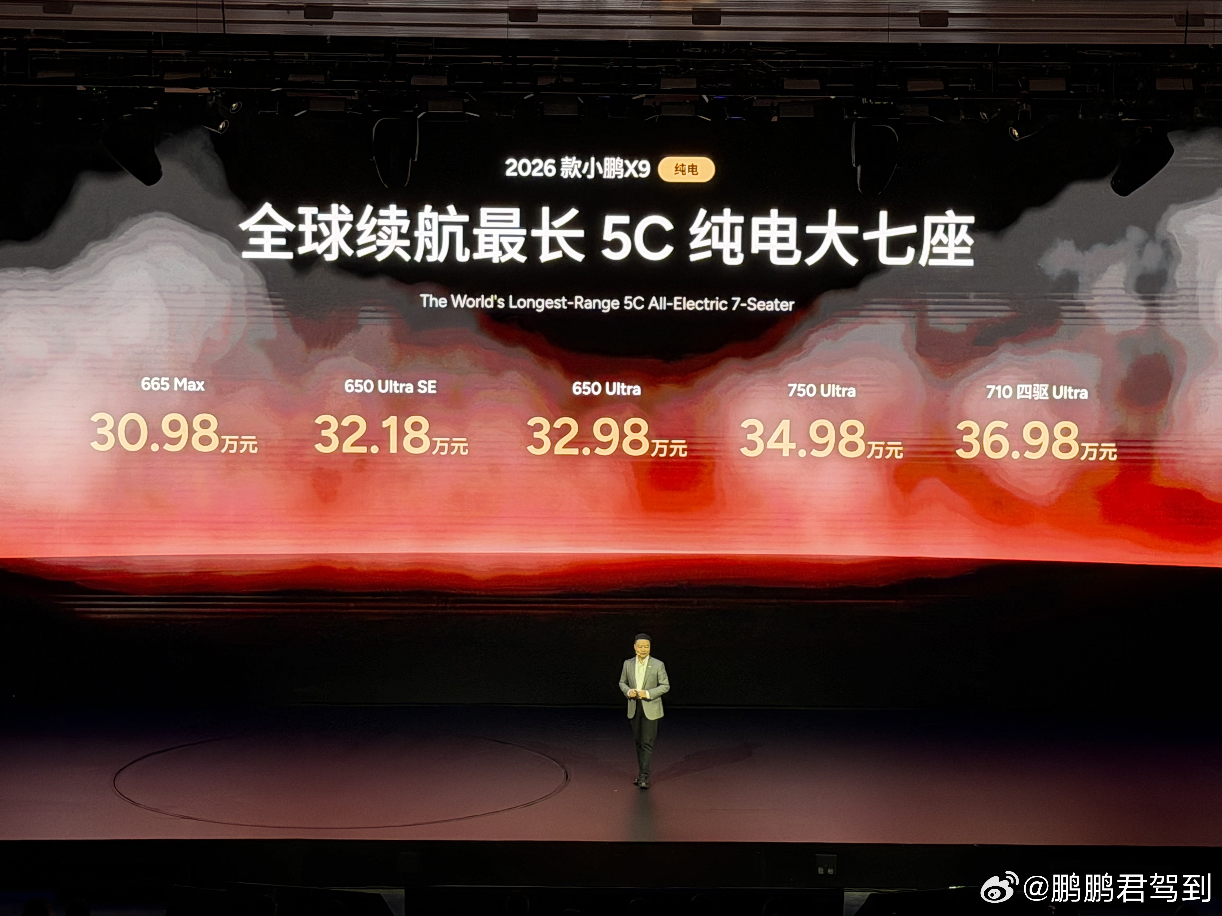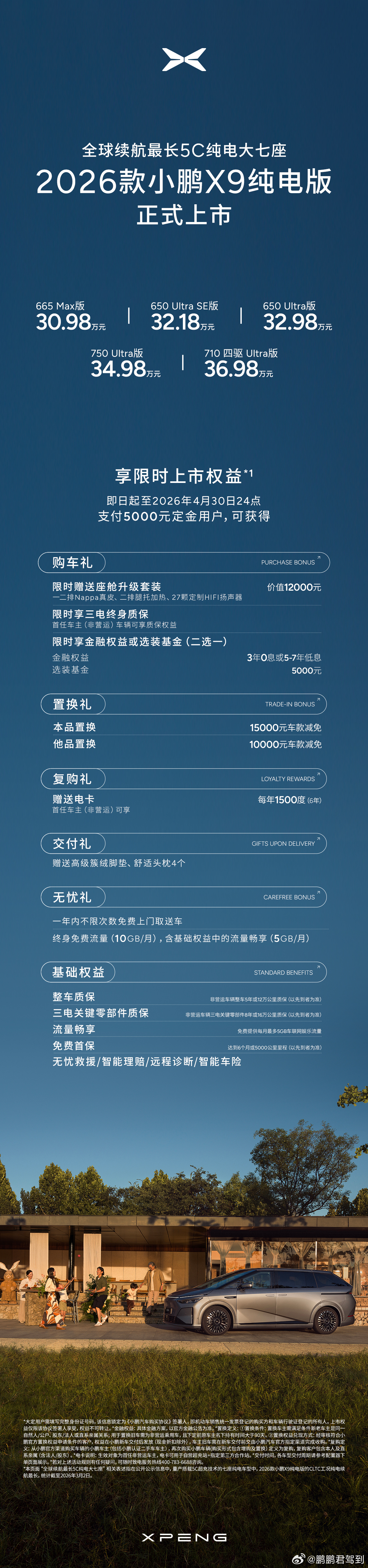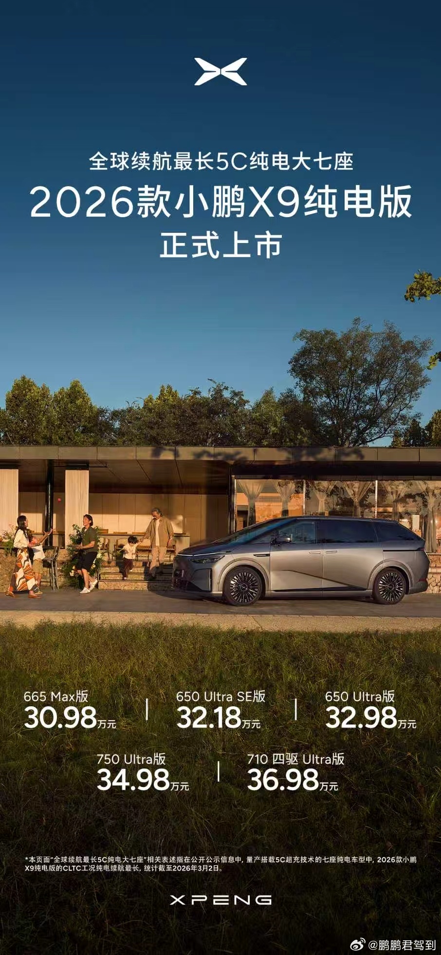 2026款小鹏X9纯电版震撼上市!售价30.98万起。大家快来看看都升级了哪些配置?新车共推出5款版型,包括665 Max、650 Ultra SE、650 Ultra、750 Ultra以及710 四驱Ultra,官方指导售价分别为30.98万元、32.18万元、32.98万元、34.98万元、36.98万元;2026款小鹏X9超级增程新增1602 Ultra SE版本,价格为32.18万元。即日起至2026年4月30日24点(含)前下定2026款小鹏X9纯电版,可享最高价值50,000元 权益限时送,包含三电终身质保、价值12,000元的座舱升级套装、至高价值30,000元金融/选装基金、至高价值15,000元置换权益以及每年1500度电卡(6年)的复购权益。2026款小鹏X9超级增程权益与2026款纯电版权益一致(2026年3月31日24:00前下定)此外24和25款的X9车主置换26款X9可以获得额外1万元的代金券补贴。(2025年11月20日已发放)还有早鸟权益限时返场,3月2日22点(含)前下定全车系,可享受2000元抵7000元购车款权益。2026款小鹏X9,两种动力,同一个旗舰标准,作为小鹏汽车的科技旗舰,希望以更全能的产品力,带给大家庭更舒适、更越级的产品体验!小鹏智驾负责人称拉开差距的时刻到了 新款小鹏X9纯电版上市30.98万起