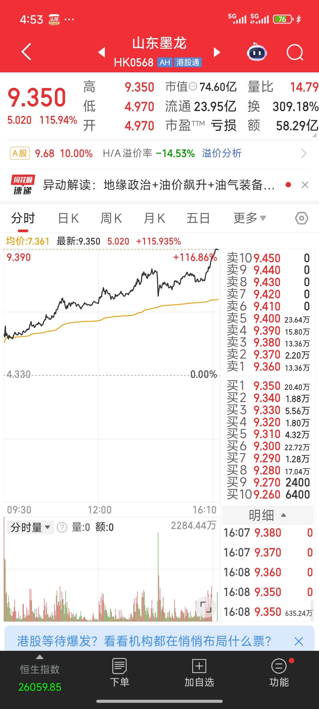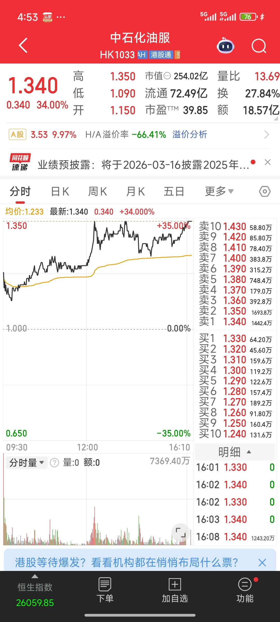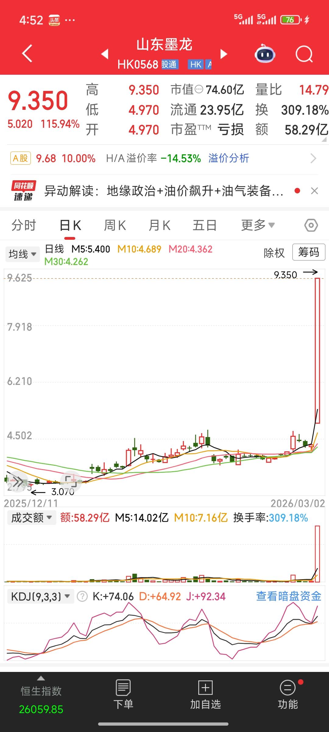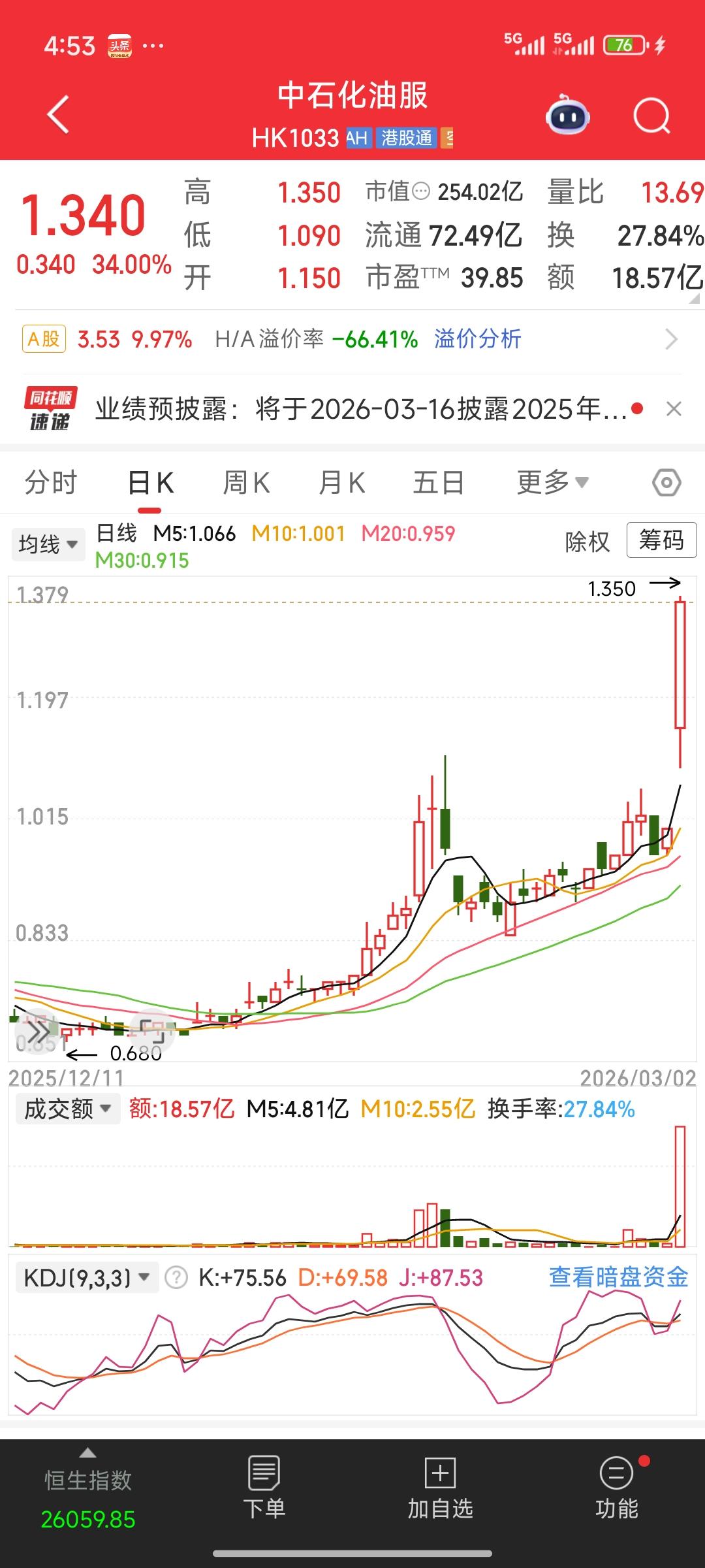 疯了疯了!!港股油气股暴涨150%!A股才涨10%,补涨空间已打开? 今日港股油气板块彻底引爆,中港石油暴涨145%、百勤油服涨107%、山东墨龙涨96%,多只个股单日翻倍,而A股油气板块整体涨幅仅在10%左右,形成明显的估值差。 这背后的核心驱动是中东战火升级,霍尔木兹海峡航运风险陡增,市场预期原油供给收缩,布伦特原油价格有望冲击120美元/桶。港股作为离岸市场,对地缘风险的反应更为直接和剧烈,而A股受国内保供稳价政策、长协锁价等因素影响,情绪传导相对滞后。 从逻辑上看,A股油气板块并非没有机会,反而存在明确的补涨空间: 1. 情绪传导:港股的暴涨会带动A股油气板块的资金关注度提升,形成板块联动效应。 2. 业绩弹性:油价上涨直接利好上游开采、油服及运输企业,A股相关公司的业绩弹性将逐步释放。 3. 估值修复:相较于港股的极致反应,A股油气股的估值仍处于相对低位,具备修复空间。 核心受益标的包括: - 上游开采:中国海油、中国石油、中曼石油 - 油服设备:中海油服、杰瑞股份、石化机械 - 油气运输:中远海能、招商轮船 所以a股的油气板块绝对还有炒作和上涨的空间。我今天已经把1/4的天通股份卖出,主要卖入油气,我觉得短时这个a股的油气股还有很大的上升空间,因为伊朗和美国的战斗,还有巴基斯坦和阿富汗的战争肯定还会短期持续,短期内不大可能结束。那么油气的上涨预期肯定还是在的。加油干就是了!油气股上扬 煤炭石油板块 美股石油股 港股领涨 油气期货 石油概念股 中石油h股配额