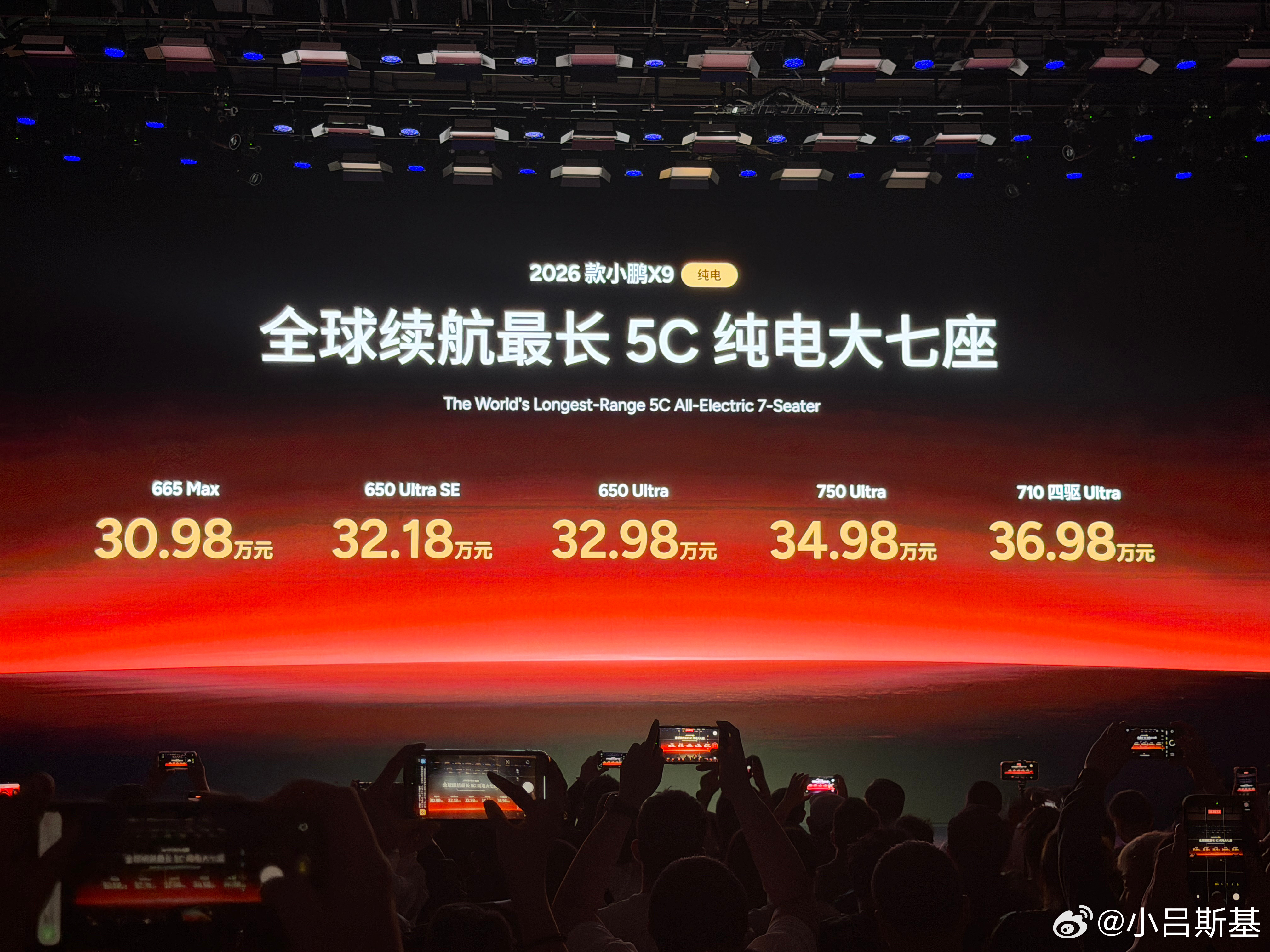 2026款小鹏X9纯电版将是首批搭载第二代VLA车型,同时续航升级到750km,标配800V+5C超充,二排零重力座椅、三排电动折叠、全车9气囊、主动降噪全都标配;至于价格30.98万起售,价格更低,叠加老车主复购权益是真香;X9增程版已经是同级别车型销量第一(26年1月份数据),期待26款纯电版销量了新款小鹏X9纯电版上市30.98万起