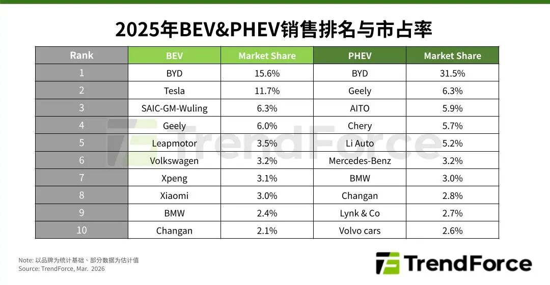 进一步分析2025年BEV排名,比亚迪(002594.SZ)年成长约25%,取代特斯拉(TSLA.US)成为销售冠军。Tesla在产品线缺乏创新的情况下,出现约9%的年衰退。SAIC-GM-Wuling(上汽通用五菱)维持第3名,第4名的Geely(吉利)凭借售价低于10万元人民币的“星愿(Xingyuan)”车款热销,市占率从3%窜升至6%。Xiaomi(小米)的市占率也从1%翻倍上升至3%,排名第八。Volkswagen(大众)销量虽有成长,但其中国市场衰退仍导致排名与市占下滑。为此,Volkswagen专为中国市场打造“ID.与众”品牌,与Xpeng(小鹏)深度合作的车型预计于2026年第一季上市,在当地开启关键新局。