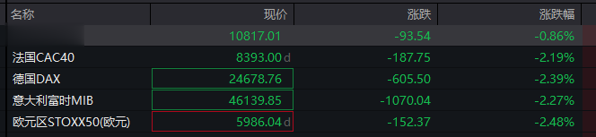 当天,全球股市普遍走低。欧股三大股指开盘大幅走低,截至发稿,英国富时100指数跌0.86%,一度跌超1%,法国CAC40指数、德国DAX指数跌超2%。此外,意大利富时MIB指数、欧元区STOXX50指数也均跌超2%。