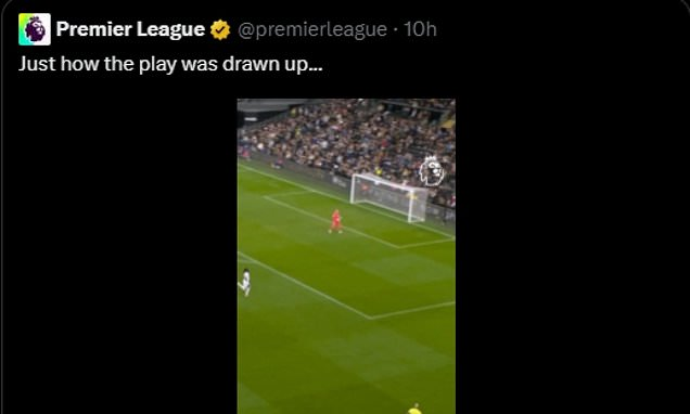 周日,热刺队在客场1-2负于富勒姆后,英超联赛官方账号发布了一段视频,视频中门将维卡里奥将任意球踢出了界外,并配文“这就是比赛的剧本安排”和“维卡里奥的精彩任意球”,还附上了一个哭笑不得的表情符号。