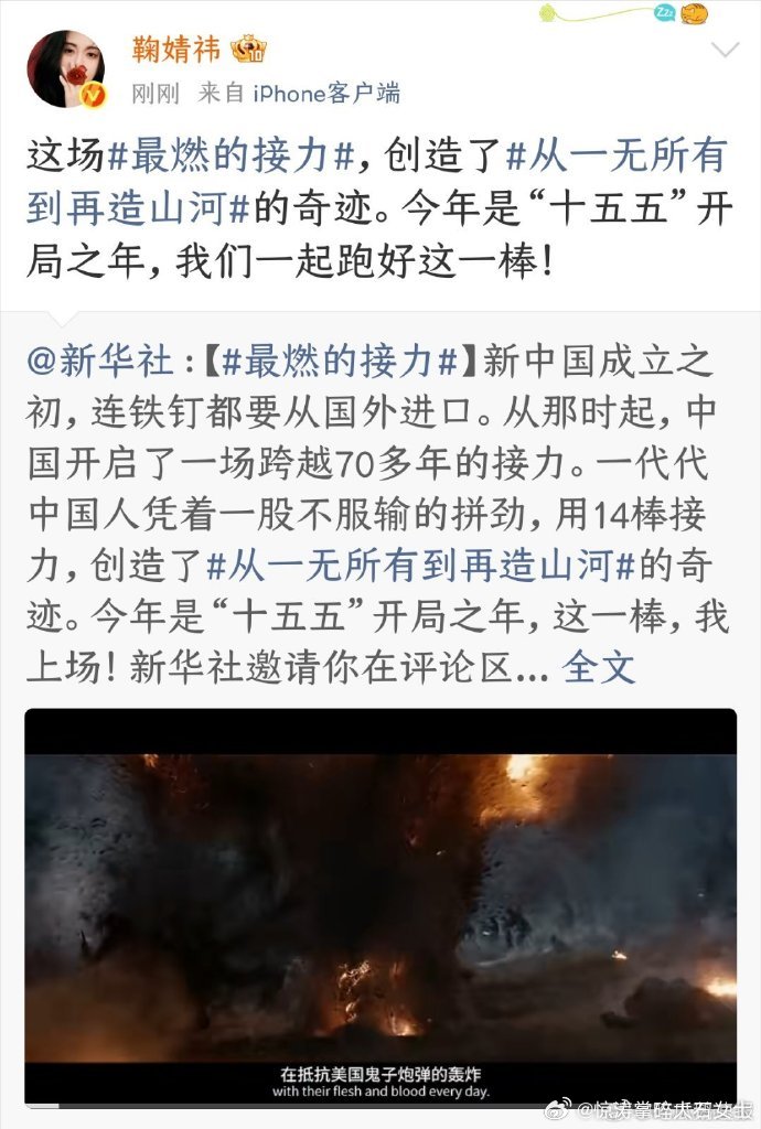 鞠婧祎我们一起跑好这一棒鞠婧祎转发支持十五五开局之年 鞠婧祎为“十五五”开局之年