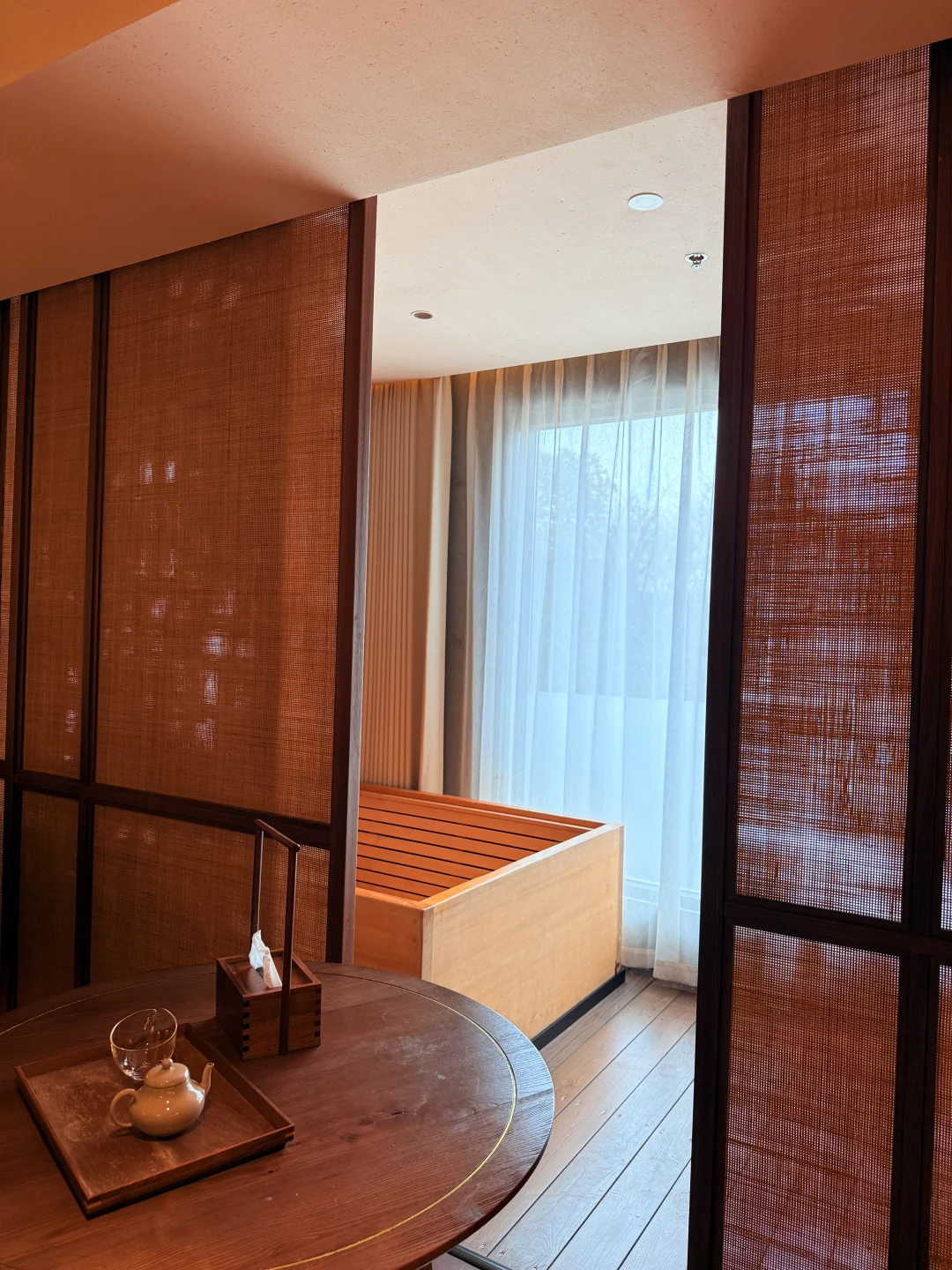 这次特意选了带私汤的房间,泡在水里的那一刻,窗外是湖州微暗的天光,只有风声和偶尔的鸟鸣。桧木的香气混着温热的泉水,感觉整个人都被治愈了。(如果带孩子来的话,他们家的亲子房也超可爱,有B-Duck和小新的主题!)