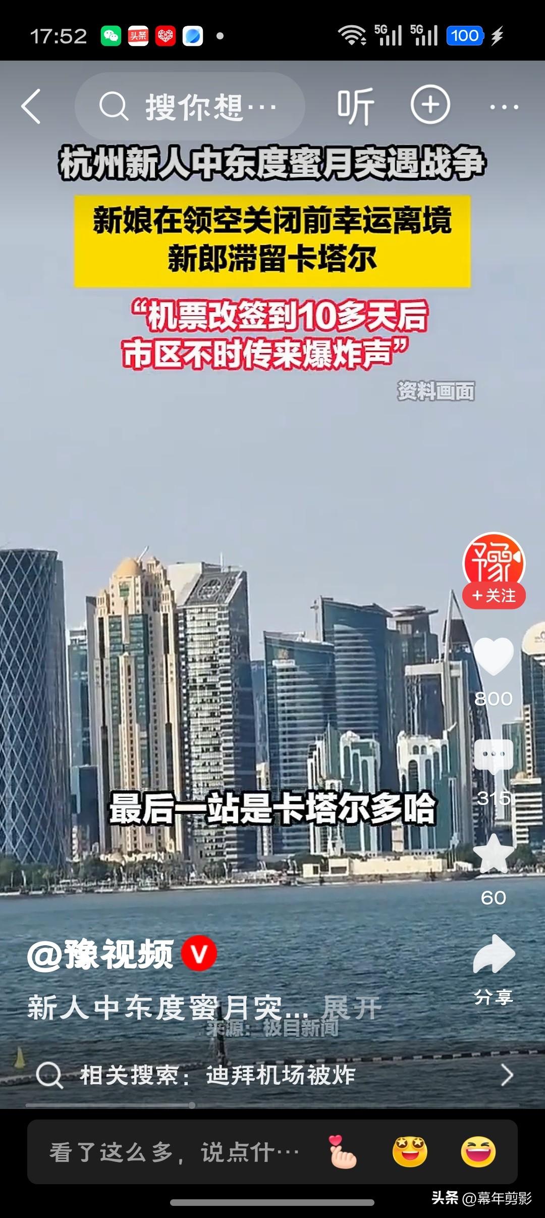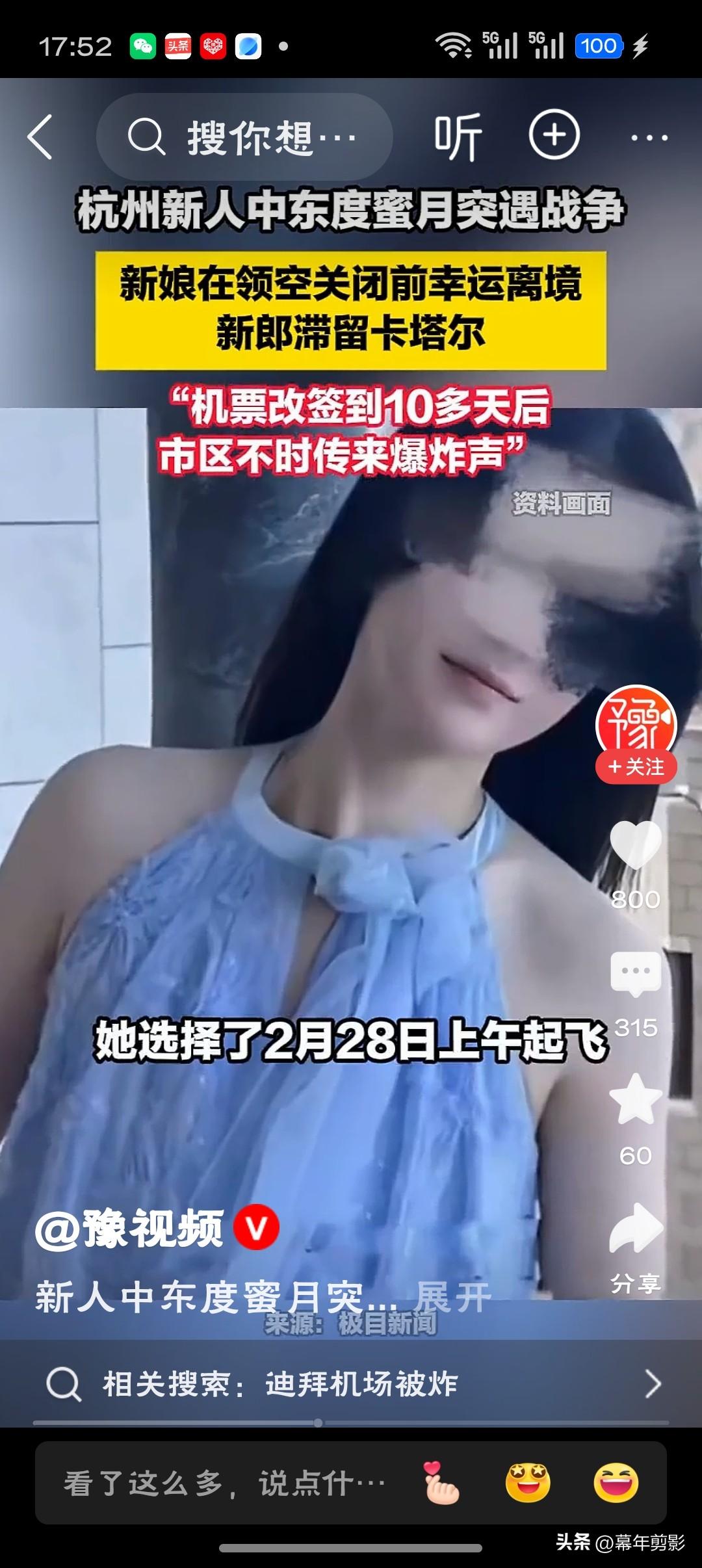 新人中东度蜜月突遇战争爆发这对杭州小夫妻的蜜月之旅,绝对是“限量版”VIP体验——别人度蜜月是“面朝大海,春暖花开”,他们是“头顶导弹,心惊肉跳”。新娘靠“积分兑换”的神操作提前“闪现”撤离,新郎却因“航班停飞”被迫开启“战地生存模式”。别人囤的是特产,他囤的是饼干和水;别人晒的是双人合照,他晒的是导弹拦截实况。这哪是度蜜月,分明是误入了“全球冲突模拟器”真人体验服!只能说:新婚快乐,但先“云”结婚几天,祝新郎早日“落地”团圆!