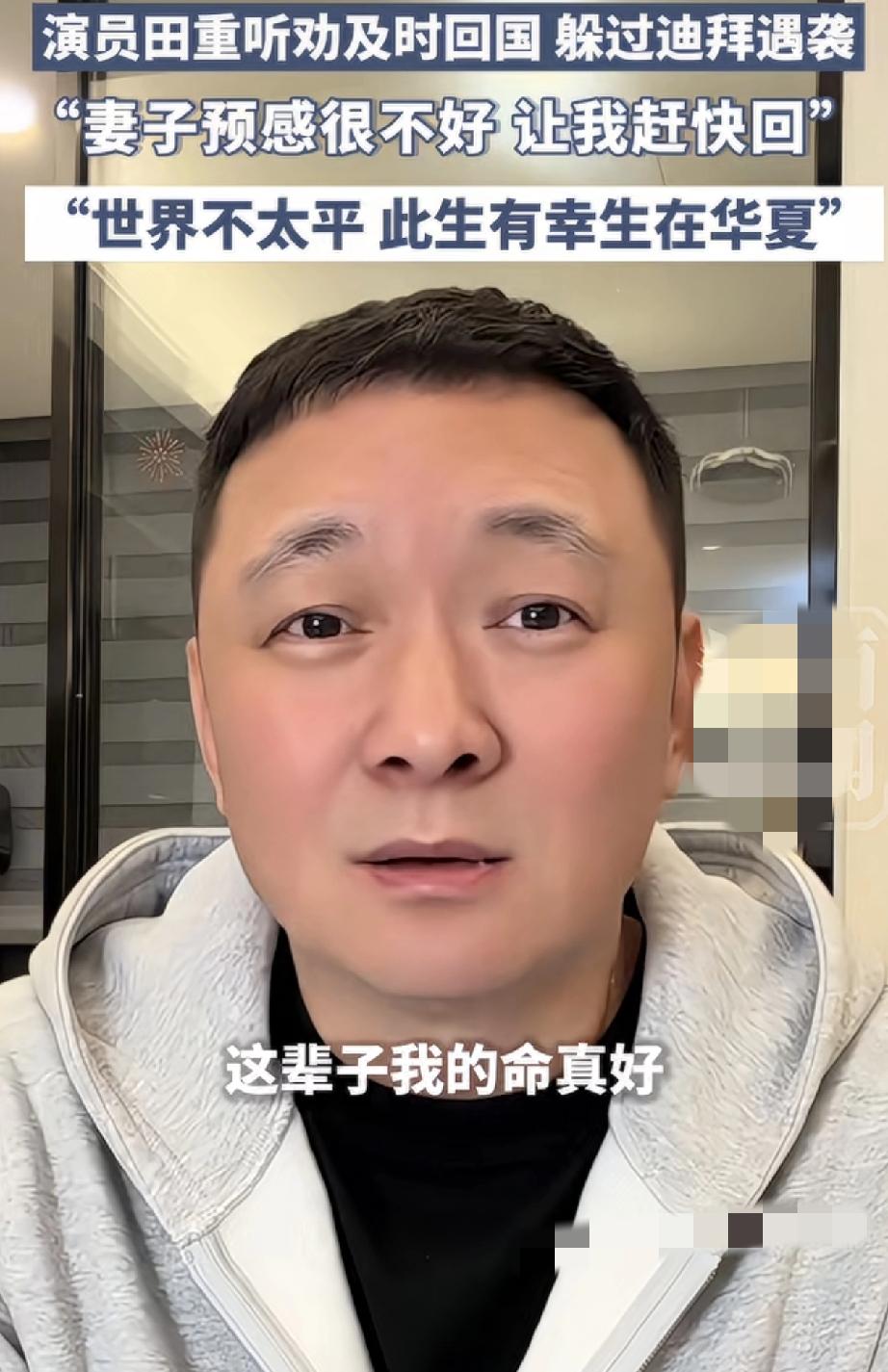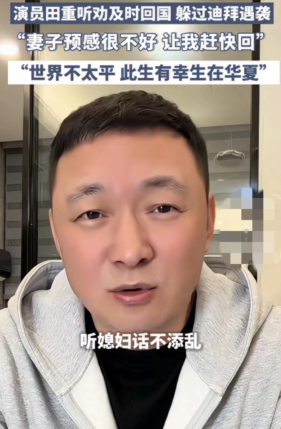 “听老婆话救我一命”!3月1日,电视剧《至尊红颜》中饰演钱小多的演员田重发视频分享,前些天他还准备去迪拜旅游,走之前还和妻子吵了一架,因为从来没有去过迪拜,他本还打算在那边多玩两天,结果妻子则非常严肃向他表示,总有种不好的预感,让他赶紧回国。这田重为了不和妻子吵架,则听妻子的劝及时回了国,也正是如此,才躲过这次的“迪拜遇袭”。 为此田重在视频中感慨道:如果当时没老婆的听话,今天可能就在帆船酒店发定位了。所以,听人劝能吃饱饭,听媳妇话不添乱。此生有幸生在华夏,祖国永远护我周全,生在中国,长在中国,这辈子我的命真好! 不得不说,多亏有个第六感很强的老婆,也多亏听了老婆的话,及时回到了祖国的怀抱,要不然这两天是真回不来了!所以,这老婆是贵人,祖国更是最坚强的后盾!真是三生有幸生于华夏,咱们命是真好!