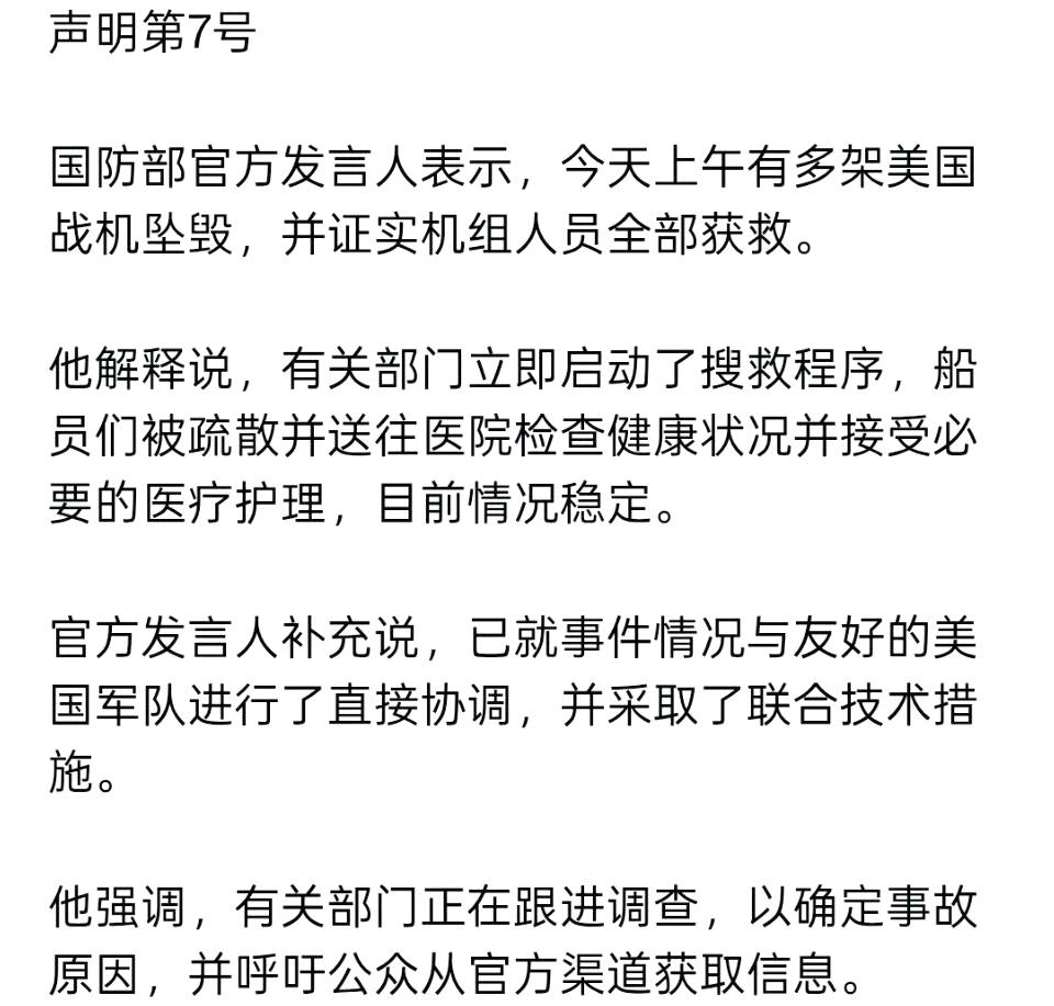 据科威特军方消息: 今天上午有多架美国军用飞机在科威特坠毁,所有机组人员均幸存。