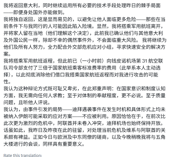 【意大利防长意外被困迪拜 将乘军用飞机从返回】据路透报道,意大利国防部长圭多·克罗塞托因美国和以色列对伊朗的袭击,与家人被困迪拜。克罗塞托原计划于周六下午返回意大利,但决定乘军用飞机返回,并将家人留在迪拜,以避免风险。