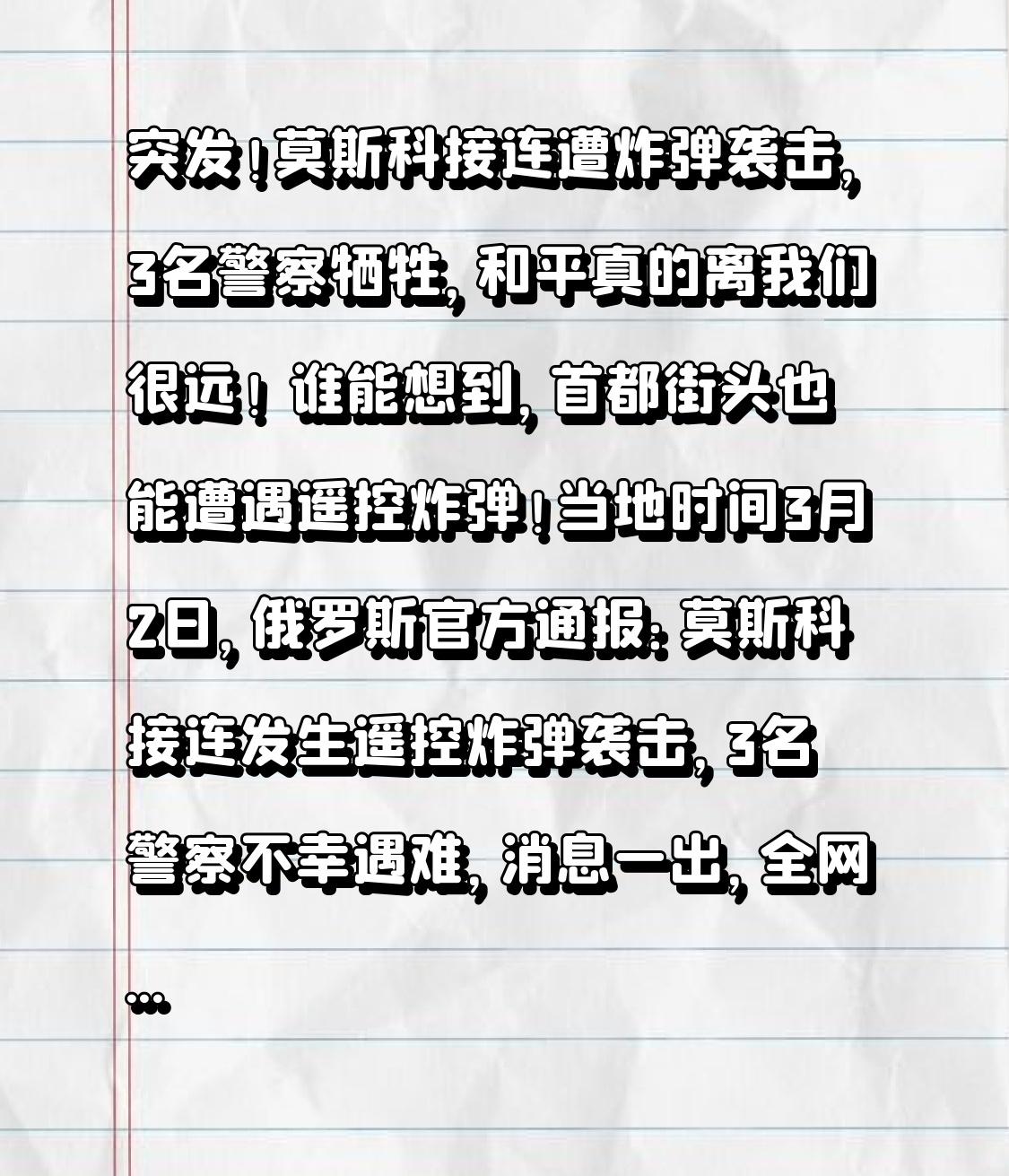 突发!莫斯科接连遭炸弹袭击,3名警察牺牲,和平真的离我们很远! 谁能想到,首都街头也能遭遇遥控炸弹!当地时间3月2日,俄罗斯官方通报:莫斯科接连发生遥控炸弹袭击,3名警察不幸遇难,消息一出,全网震惊。 很多人以为战争只在新闻里,可这次袭击就发生在莫斯科市区,一处在居民区附近,一处在火车站广场,都是普通人日常出没的地方。袭击者用遥控装置引爆随身物品,专门针对巡逻警察,手段隐蔽、防不胜防。这些警察只是在维护城市安全,却成了冲突的牺牲品,让人无比痛心。 更让人意外的是,这不是偶然事件!俄内务部披露,两起袭击分别发生在2025年12月和2026年2月,均受境外势力关联人员策划,目的就是制造恐慌、扰乱秩序。原本安稳的首都,如今全面升级安保,街头巡逻、安检加密,人人自危。我们总觉得战乱遥远,可现实告诉我们,没有绝对安全的角落,冲突正在以更隐蔽的方式蔓延。 这件事也给所有人敲响警钟:我们不是生活在和平的时代,只是生活在和平的国家。看看国外接连不断的袭击、战火、恐慌,再想想我们出门不用担惊受怕,夜晚可以安心散步,这份安稳来之不易。 我们谴责一切恐怖袭击,哀悼无辜牺牲者,愿逝者安息。也提醒所有海外同胞,时刻关注安全提醒,远离危险区域。世界并不太平,珍惜我们眼前的和平,更感恩祖国给我们的安全感。