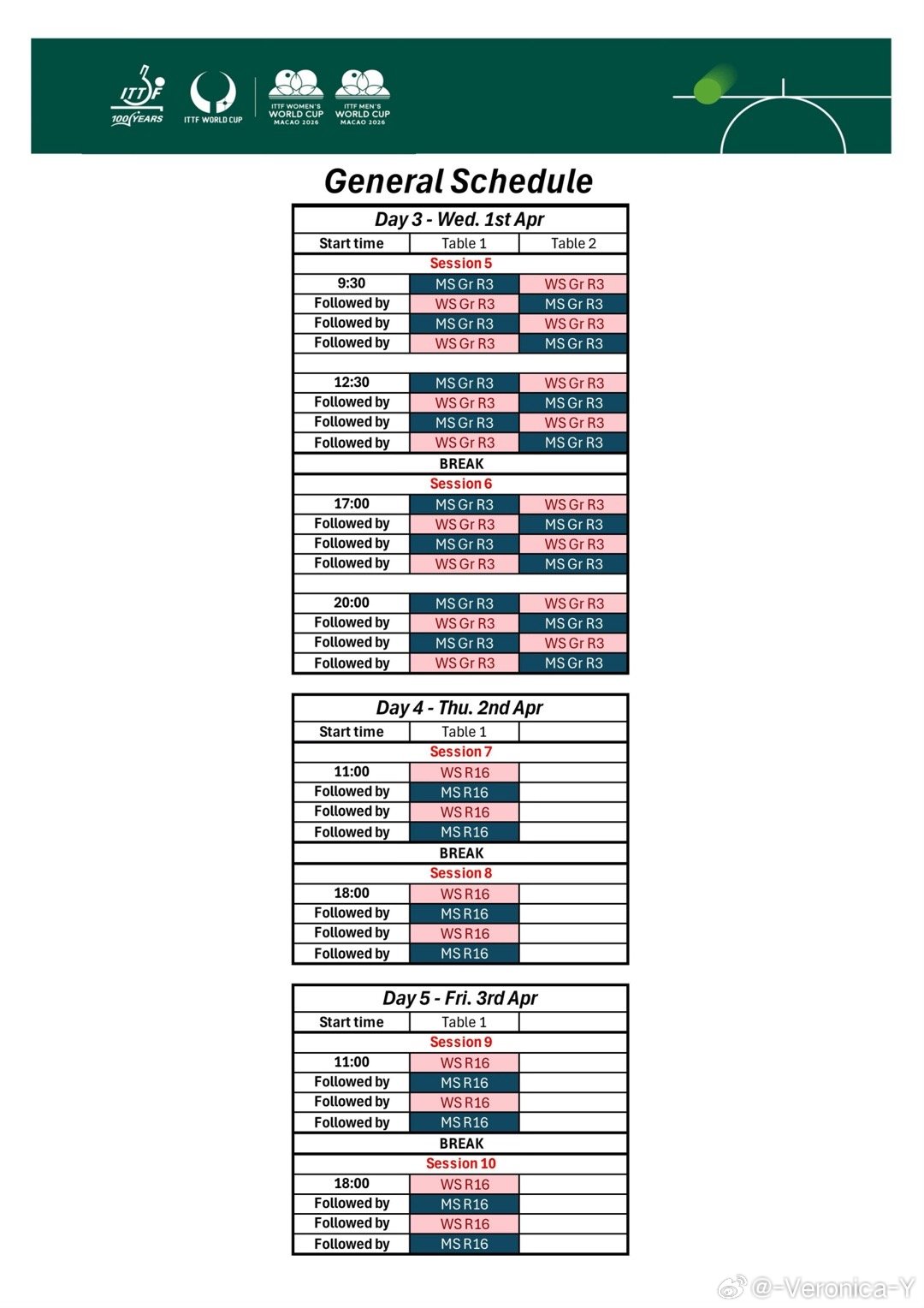 2026澳门世界杯·赛程安排两大变化1 取消了男女球员分桌制度 一共两个桌 男女运动员交替在两个桌上比赛