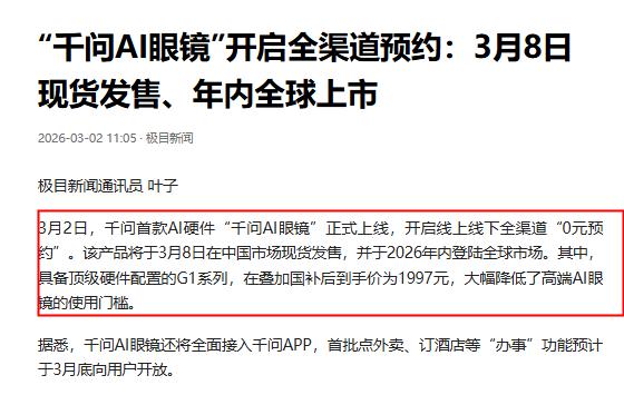 千问AI眼镜MWC全球首秀,这事没那么简单,背后逻辑很多人都没看明白! 3月2日,千问首款硬件产品“千问AI眼镜”正式上线并开启0元预约。同日,千问AI眼镜在巴塞罗那MWC世界移动通信大会上亮相。 表面看这事很简单,就是千问发布了一个AI眼镜,然后在MWC上亮了个相。 但是细思就极恐了,据悉,这次的千问AI眼镜,3月2号线上线下0元预售,将会在3月8日在中国市场进行现货开售,同时计划在2026年内登陆全球市场。 一上线就登上MWC,并且还明确2026年要进入全球市场,这就表明,千问对于自己的这款AI眼镜信心很足,一直锚定的就是全球市场,对标的是Meta、苹果等国际巨头。 事实上,千问AI眼镜还真有这个实力。 因为其定位是软硬一体、跨多种终端的AI助手,所以咱们会发现,它全面接入了千问APP,直接具备了一句话点外卖、订酒店、打车的“办事”能力。 再加上,千问AI眼镜搭载的都是最新一代的千问大模型,技术能力也很强,能够支持高精度多模态理解和实时交互,覆盖了高清拍摄、AI翻译、会议记录等各种场景。 价格方面,千问AI也优势明显,其主打性价比的G1系列到手价最低仅需1997元,远比国外的AI眼镜更便宜。 由此可见,千问AI眼镜这一次登上MWC,与其说是亮相,倒不如说是一个标志,中国AI开始站上世界舞台,和西方AI展开正面对等竞争的一个信号!