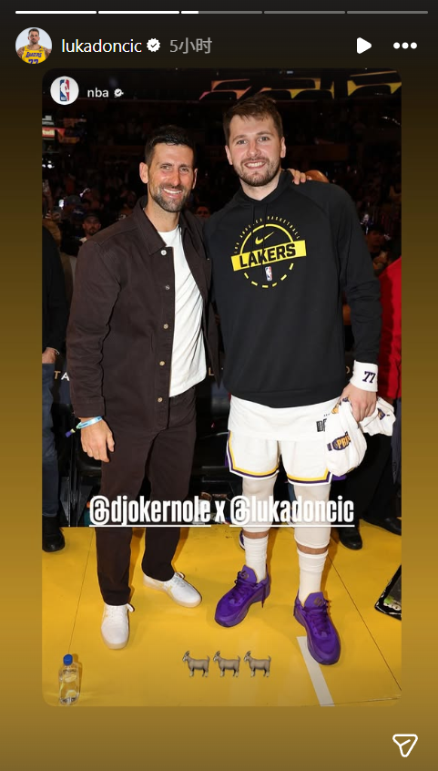 赛后,东契奇ins转发了自己与塞尔维亚网球名将德约科维奇的合照并配文:“。”