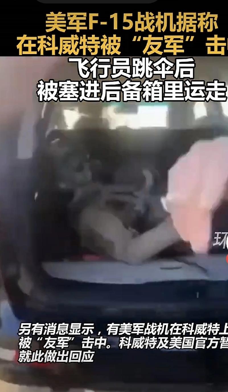丢不起那人,美国跳伞飞行员被塞后备箱拉走,你好歹弄个救护车表示一下也对美国大兵的尊重呀! 截至2026年3月2日 18:00,数架美军战机在科威特境内坠毁。所有机组人员全部生还,已送医、状况稳定。至少1架F-15E“攻击鹰”坠毁(社交媒体视频:尾部起火、螺旋坠落、飞行员弹射逃生)。 坠毁地点科威特北部/西部,靠近美军基地(阿里·萨利姆基地附近) ,平民协助救援,飞行员被安全转移。 伊朗宣称:击落1架入侵伊朗领空的美军F-15,坠于科威特。中东媒体与社交平台广泛提及, 称被己方防空/战机误击。 美军未表态,事故调查未排除技 术原因。截至目前,美军尚未发布官方声明,未承认伤亡与坠毁原因。