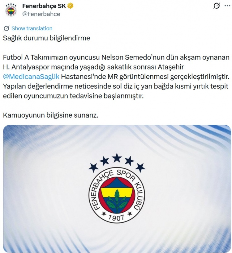 消息称塞梅多在昨晚对阵安塔利亚体育的比赛中受伤,经过MRI检查确认其左膝内侧韧带部分撕裂,目前已开始接受治疗。