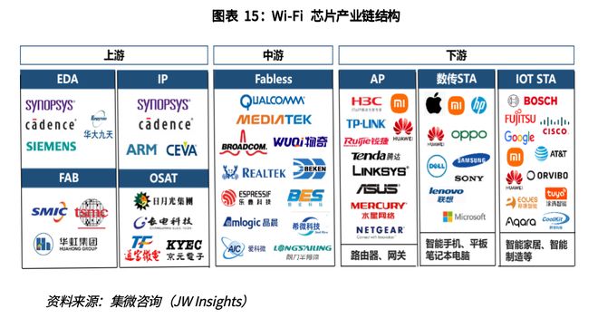Wi-Fi芯片整体产业链结构与蓝牙芯片基本一致,芯片设计公司以Fabless为主。