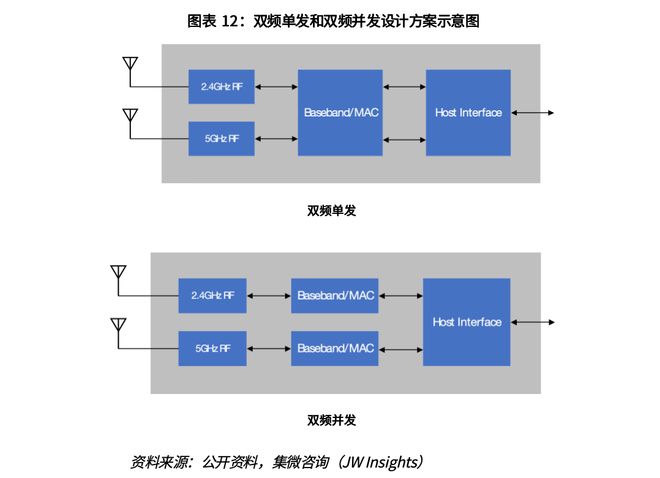 为兼顾两个频段的优点,一种可选方案是双频单发,该方案只包含一个WLAN基带/MAC模块及两个独立(2.4GHz和5GHz)的射频模块,借助一定的切换方案对射频模块进行选择,这种做法需要软件调度策略做到灵活且具备实用性;另一种方案是多频并发,该方案通过增加WLAN基带/MAC模块,采用相对简单的调度策略应对更复杂的应用场景,如中继。