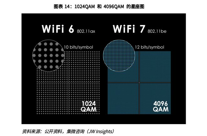 为进一步提升吞吐量,Wi-Fi6首次采用1024QAM调制方式,Wi-Fi7支持最高4096QAM的调制方式,相同频宽下,更高阶的调制方式可有效提升系统的速率,同时也使得系统对一些内部/外部的非理想性条件极其敏感。如协议规定1024QAM对EVM的要求为-35dB,而4096QAM对EVM的要求达到-38dB,这对系统射频器件的指标及算法设计提出了极大的挑战。