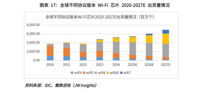 从产品代际来看,Wi-Fi4芯片技术壁垒较低,目前主要用于IOTSTA端,国内厂商出货量较高,但芯片ASP低,整体市场规模相对较小。Wi-Fi5芯片主要应用数传STA领域,由国外厂商主导,国内厂商如晶晨、展锐已大规模量产。Wi-Fi6芯片技术壁垒高,Wi-Fi6数传芯片目前国内厂商正处于小规模量产/产品导入阶段。