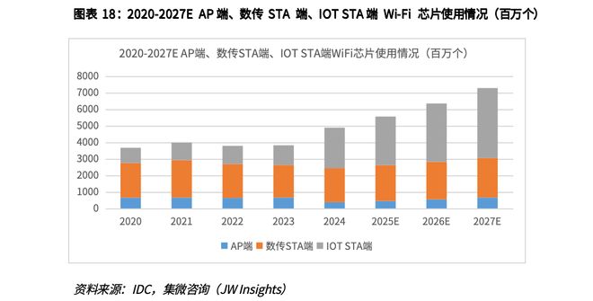 3、IoTSTA端:即物联网站点端,主要用于智能家居、白电等嵌入式设备,通过无线网络实现远程控制和数据传输。整体来说,IoT端的芯片需要支持低成本、低功耗、小尺寸等性能指标。目前市场IOTSTA设备终端主要使用Wi-Fi4芯片。