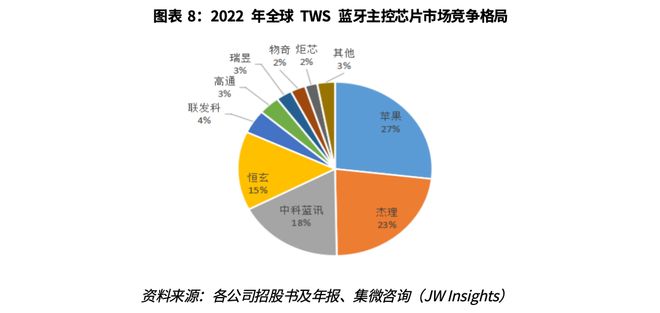 从2022年全球TWS蓝牙主控芯片出货数量来看,市场第一梯队为苹果、杰理、中科蓝讯、恒玄,占据接近八成的份额。联发科、高通及国内厂商也基于其各自产品优势和定位占据一定市场份额。