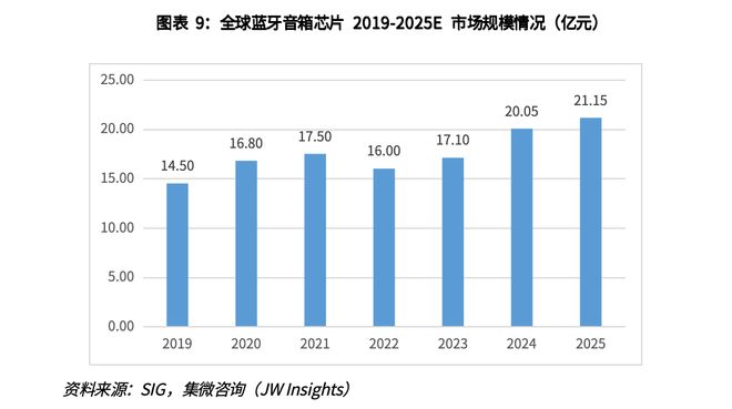 SIG数据显示,2021年蓝牙音箱出货量趋近3.5亿台,预计2025年出货量将增长至4.23亿台。集微咨询预测,蓝牙音箱芯片2022年市场规模约16亿元,2019-2025年CAGR约为6.61%。