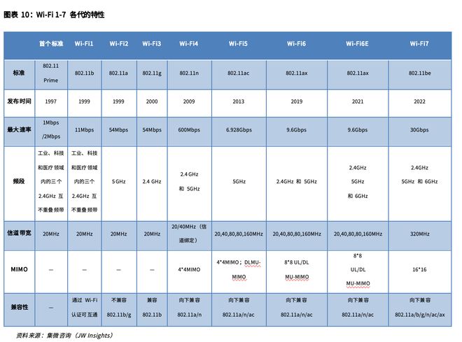 如上表所示,Wi-Fi芯片产品的关键指标主要为宽的信号带宽、及多频段同时工作。