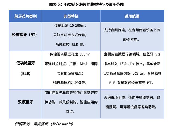 蓝牙芯片主要可分为经典蓝牙芯片(BT)、低功耗蓝牙芯片(BLE)、双模蓝牙芯片(BT+BLE)。经典蓝牙芯片(BT)主要用于音频传输;低功耗蓝牙芯片(BLE)主要用于数据传输,在低功耗音频LEAudio标准颁布以后,也可用于音频传输;双模蓝牙芯片可实现BT和BLE两种模式同时工作,可同时实现音频和数据的传输。