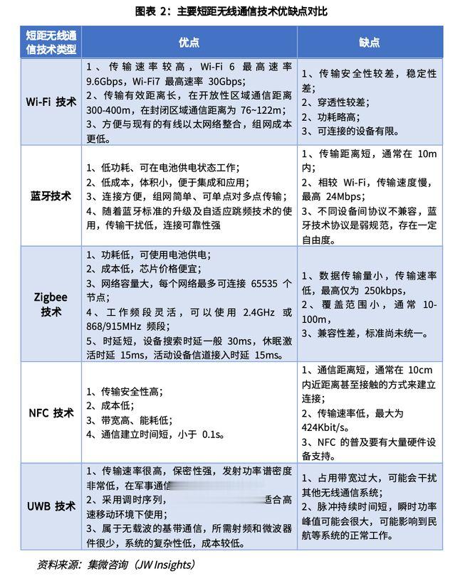 基于不同应用场景及性能需求,不同短距无线通信技术可适配于不同的场景及终端,下文将对其性能优缺点及适配场景进行简单介绍。