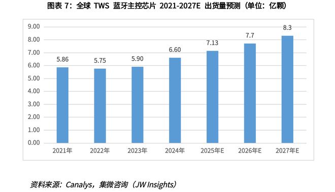 根据Canalys数据,2024年全球TWS蓝牙主控芯片出货量约为6.6亿颗。集微咨询预测,预计在2027年增长到8.3亿颗,三年CAGR约为8%。