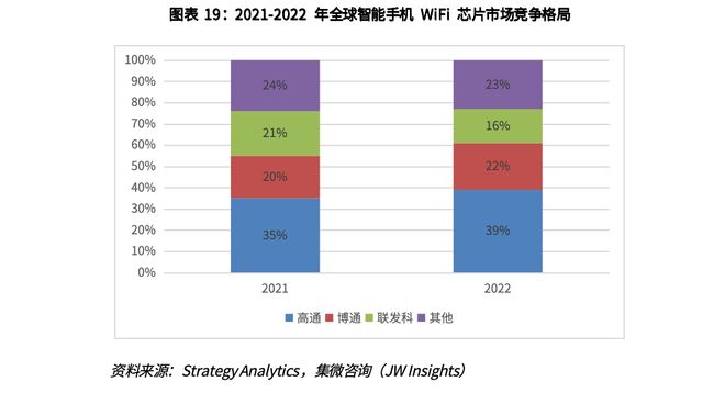 其中,智能手机作为数传STA端中占比较大的Wi-Fi芯片应用终端,高通、博通、联发科近两年均占据全球接近80%的市场份额。2022年高通占比进一步提升,市场份额约为39%,博通和联发科市场份额约为22%和16%。