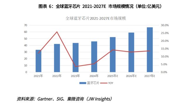 据Gartner数据,2024年全球蓝牙芯片市场规模约为45.8亿美元,随着蓝牙芯片智能终端需求量的增加及蓝牙芯片价值量的提升,蓝牙芯片整体市场规模预计将继续保持较快增长。集微咨询预测,2025年蓝牙芯片市场规模可达52.3亿美元,到2027年达到67亿美元,三年CAGR约为14%。