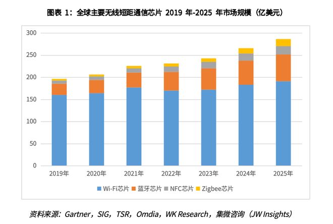 在过去几十年,随着移动通信技术的发展以及智能物联网时代的来临,无线短距通信技术得到迅速发展。集微咨询测算,全球主要无线短距通信芯片(包括Wi-Fi芯片、蓝牙芯片、NFC芯片、Zigbee芯片)2019年-2025年市场规模从196.25亿美元增长至286.22亿美元,复合增长率约为6.5%。其中蓝牙芯片、Wi-Fi芯片占比最大,