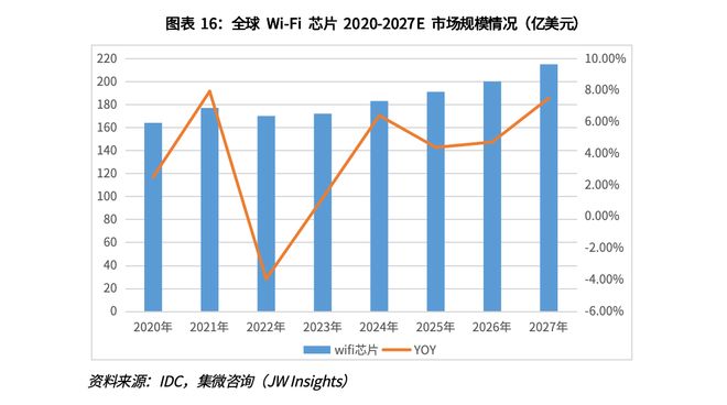 集微咨询数据显示,2022年全球Wi-Fi芯片市场规模约为170亿美元,预计到2027年Wi-Fi芯片市场规模将达到215亿美元。2022年到2027年间复合增长率约为4.8%。