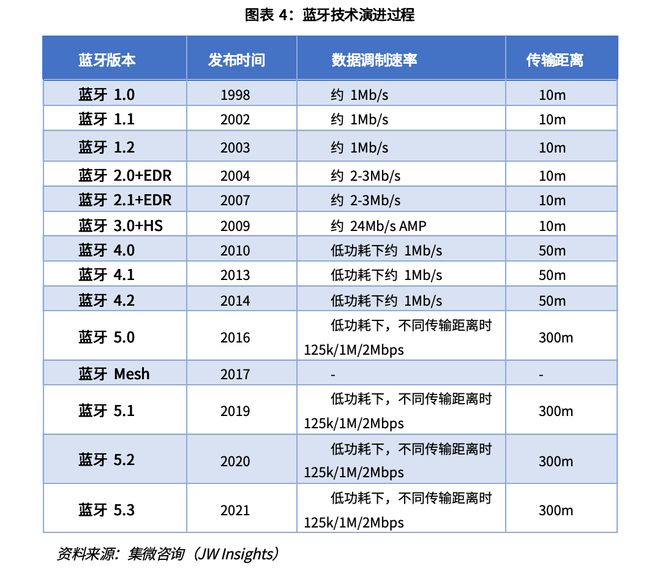 蓝牙技术最早由爱立信公司在1995年提出,主要应用于蓝牙音频领域。随后,1998年蓝牙技术联盟SIG成立,制定和维护蓝牙技术标准。2010年蓝牙4.0发布,最大传输速率达24Mbit/s,2016年蓝牙5.0推出,传输能力进一步提升,同时功耗降低至毫安甚至微安级别。2021年,SIG发布了蓝牙5.3,功耗降低的同时还新增了经典蓝牙BR/EDR的安全性。