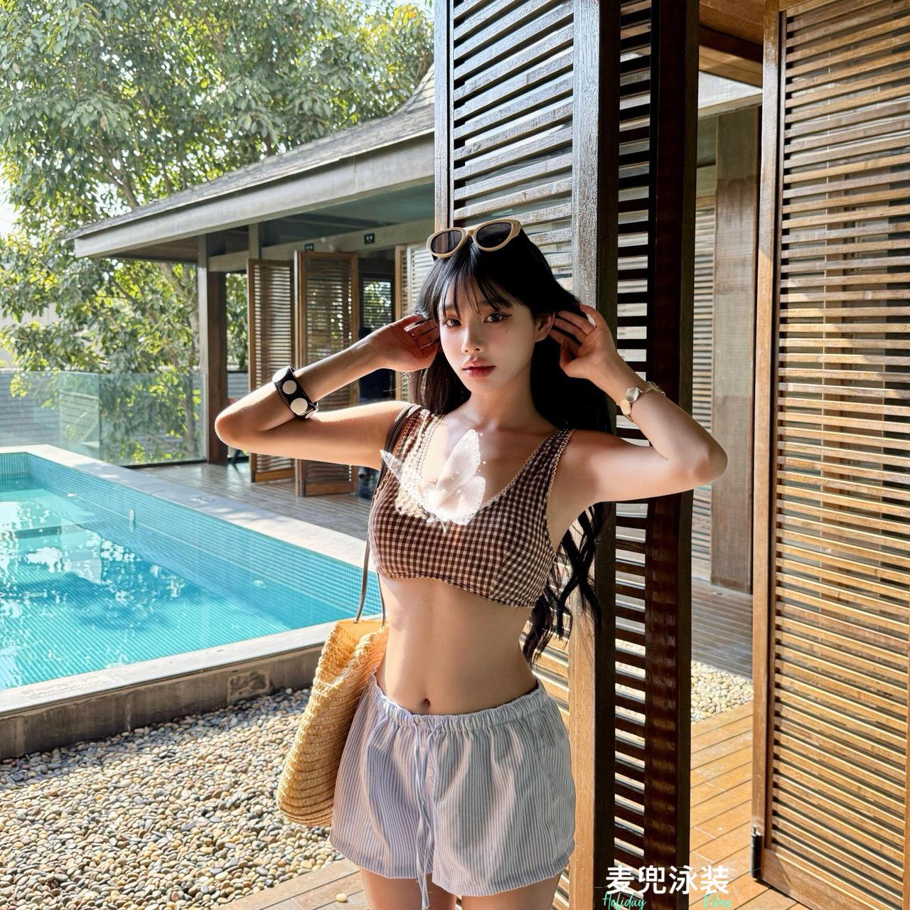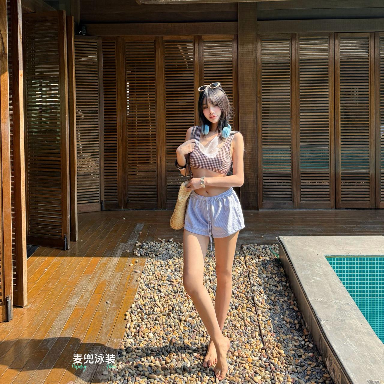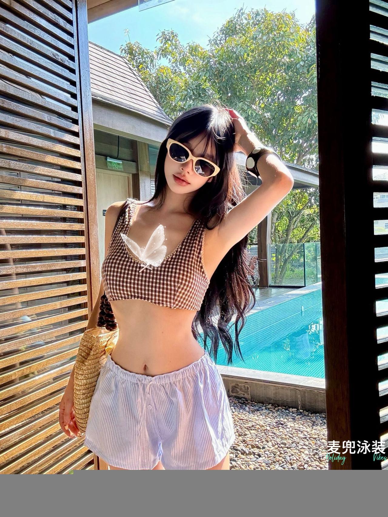 复古棕咖格纹分体泳衣 纯欲甜妹度假必备度假风泳装美女 泳装穿搭风格 泳装度假风格