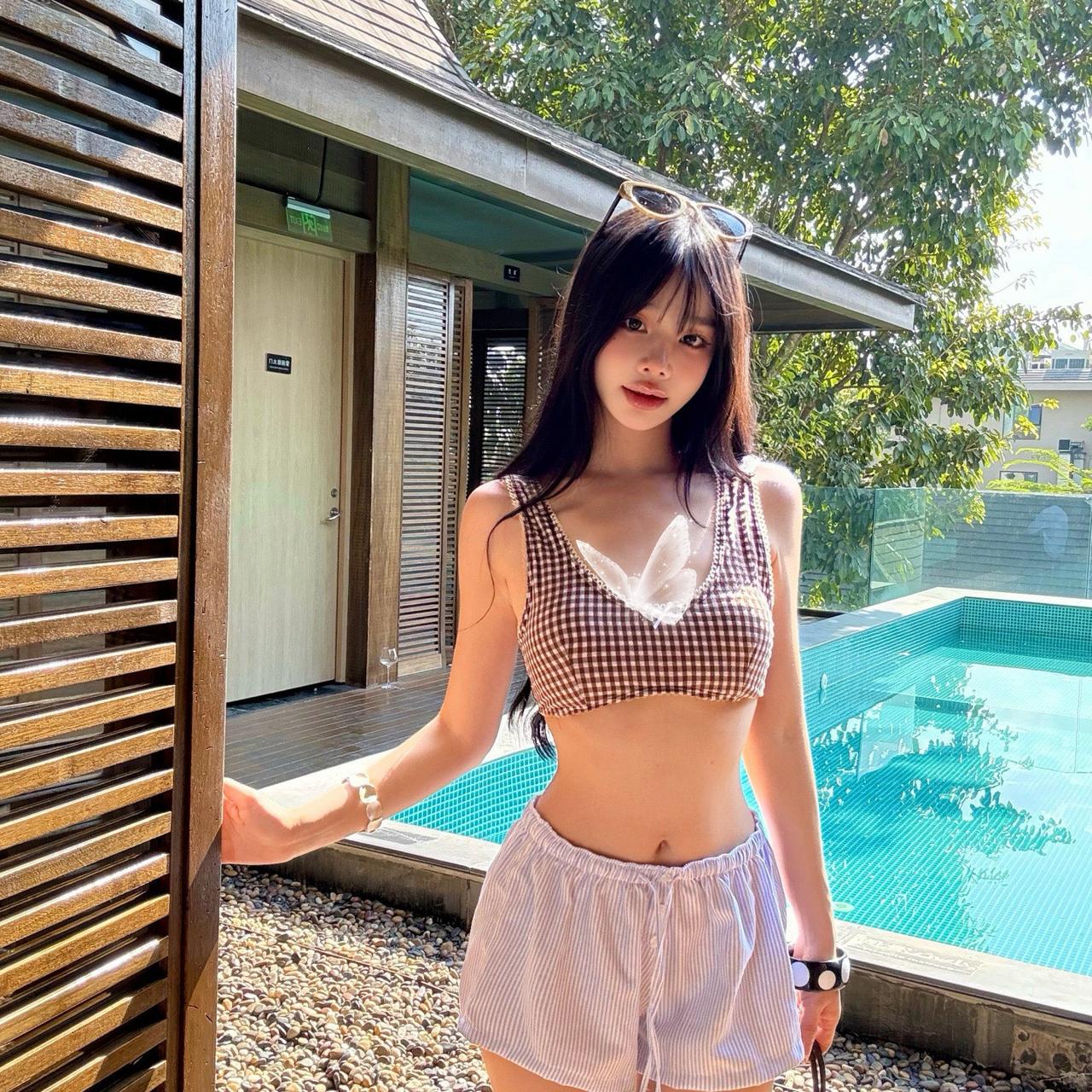 复古棕咖格纹分体泳衣 纯欲甜妹度假必备度假风泳装美女 泳装穿搭风格 泳装度假风格 紫色比基尼穿搭 比基尼度假穿搭 粉紫泳衣 甜美连体泳衣 甜辣泳装穿搭 去海边,泳衣怎么选? 泳衣 沙滩泳装美女比基尼