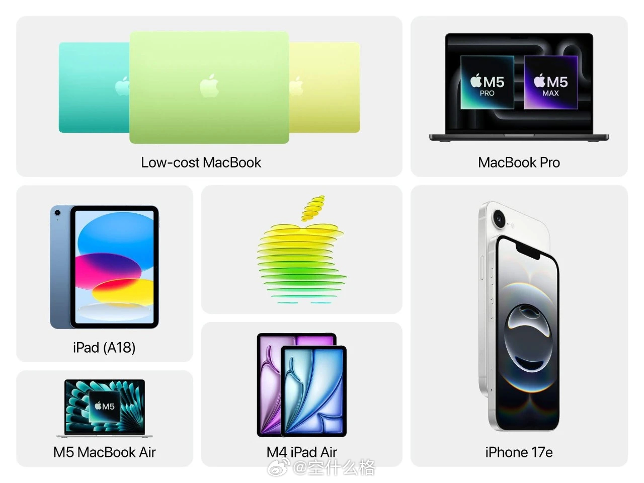 汇总各方消息,苹果最近 3 天预计会发布以下产品:- iPhone 17e- MacBook(A18 Pro)- MacBook Pro(M5 Pro/Max)- iPad(第 12 代)- iPad Air(M4)