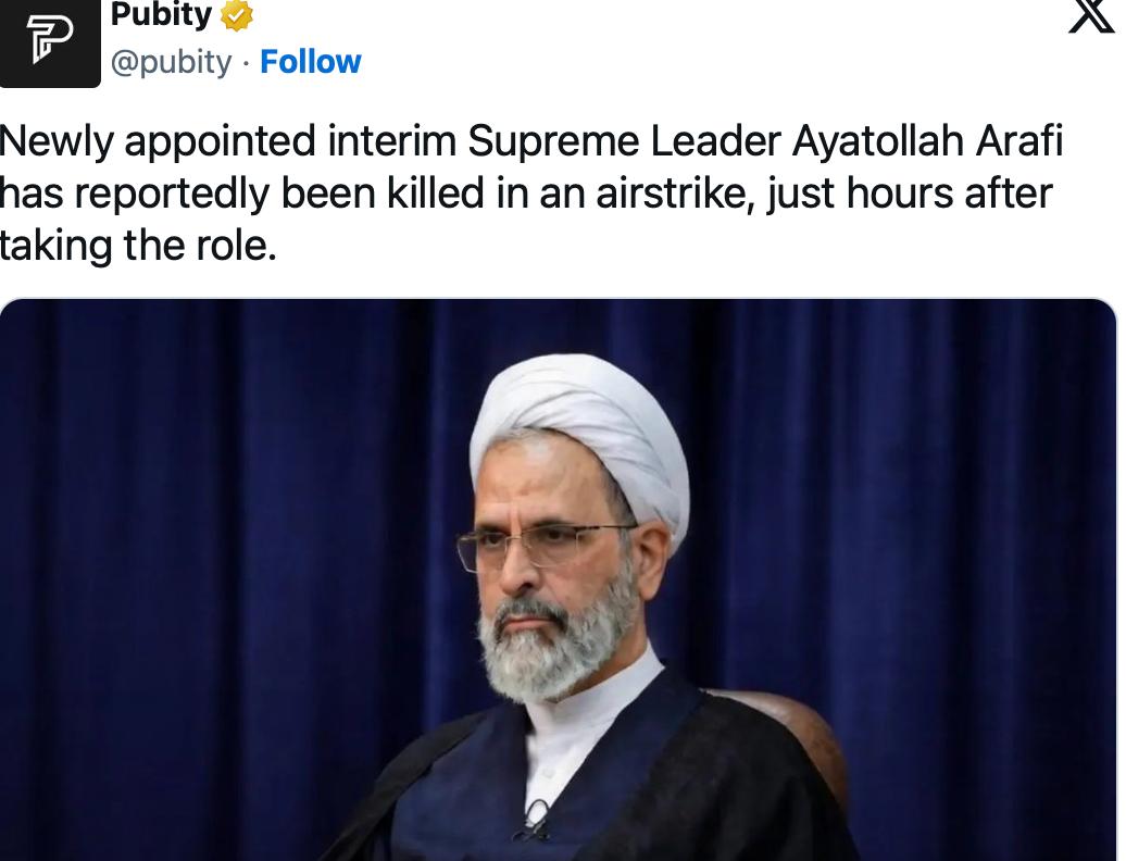 【伊朗临时最高领袖刚上任几小时被杀?】 根据印度“星期日卫报”的报道称,3月2日社交媒体上突然传出了伊朗临时最高领袖阿拉菲被杀的消息,这颇令人诧异,美国和以色列的行动未免也太快了! 2月28日,执掌伊朗数十年的最高领袖哈梅内伊与数十名军政高层同时被“斩首”,伊朗方面迅速做出反应,在3月1日宣布组建一个临时领导委员会来领导国家,同时还宣布由哈梅内伊的亲信、67岁伊朗资深神职人员阿拉菲暂时代理最高精神领袖的职务。 未料3月2日突然传出阿拉菲上任不到一天便死于以色列空袭的消息,按照社交媒体上所传出的消息,阿拉菲是在就任临时最高领袖后的几个小时被杀,目前以色列方面还未证实这一消息,以色列多家媒体也未给出进一步说明,伊朗官方也未回应这一消息,而长期追踪伊朗内幕消息的“伊朗国际”也未给出相关说明,现在来看,只能继续让“子弹飞一会”。 不过若阿拉菲真的被杀,对伊朗目前的权力运作而言其实没有大影响,因为目前的实际管理者是拉里贾尼,哈梅内伊死之前已经把大权交给了他,但阿拉菲阵亡如此之快,这不由得令人质疑:伊朗内部究竟被渗透到了哪种地步?接下来还有人敢再临时接掌最高领袖之位吗?